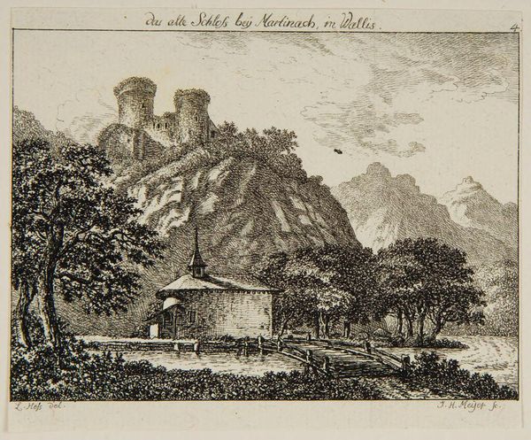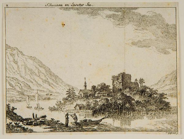 Editor: Here we have Johann Heinrich Meyer's "Weggis on Lake Lucerne," from the 18th century. It's a lovely etching. I find the scene so peaceful. What symbols or visual cues do you see that speak to its time and cultural context? Curator: The church spire, centrally placed, suggests a society where religious life is integrated into the landscape and consciousness. The mountains, rendered in detail, symbolize both the grandeur and the challenges of nature. Do you see how they dwarf the human figures? Editor: Yes, they do! It's a reminder of humanity's place within something much larger. I’m starting to see that this isn’t just a pretty picture. Curator: Exactly. Images like these helped shape and solidify cultural identities. What do you think this image says about the relationship between humanity and nature in the 18th century? Editor: I guess I see a harmonious coexistence, but also a sense of scale and power. Thanks, I hadn't considered the deeper implications. Curator: Indeed, every element tells a story.