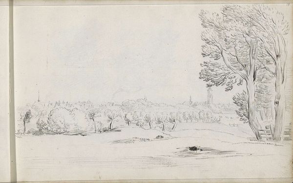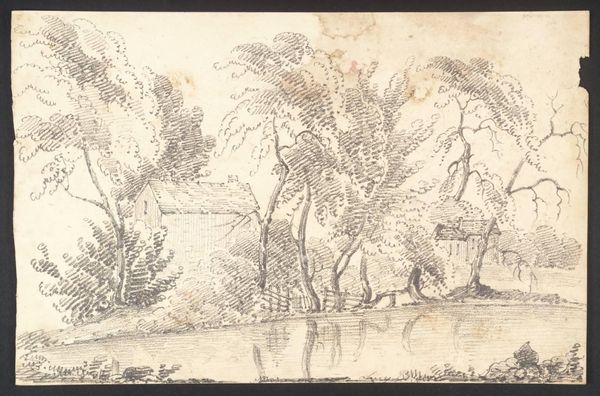 Curator: This sketch, from the British School, shows a tranquil waterscape. It's roughly 131 by 179 millimeters. What strikes you first about it? Editor: Its somber tone, definitely. The muted grays and the sketchy quality give it a melancholy feel. The artist's touch on the paper seems so light. Curator: The artist's focus seems to be on the bridge, which is placed in the center of the composition. The presence of the bridge in this landscape offers a suggestion of human intervention within a natural scene. Editor: The repetitive lines used to construct the trees, and even the water, are fascinating too. It shows a methodical process of building forms from simple marks. Curator: Sketches like these often served as preparatory works, explorations of form and light for larger paintings. The materials themselves – paper and graphite – were relatively inexpensive and readily available. Editor: It's wonderful how such humble materials can evoke such a strong sense of place and mood. It really pulls you in. Curator: Yes, it reveals how the landscape's essence is captured through the interplay of these simple materials. Editor: I'm left contemplating the artist's intent and the social context. Fascinating.