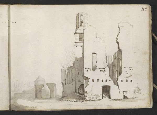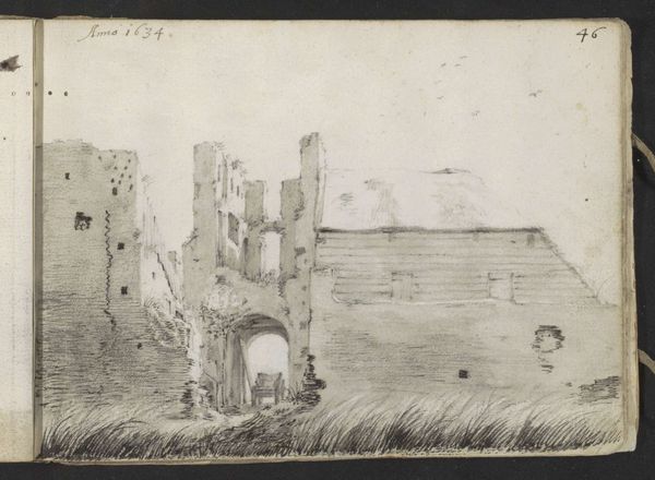 Gerard ter Borch sketched this ruin near Haarlem with graphite on paper. The artist’s attention to the materiality of the ruin itself is striking; he uses the graphite to describe the rough texture of the crumbling brick and stone. Look at the ways the sharp, dark lines contrast with the lighter strokes, conveying the play of light and shadow on the broken surfaces. Ter Borch was likely using graphite sticks, as pencils encased in wood were not yet common. The direct application allowed for varied pressure and shading, critical to capturing the building's decay. Ruins had a powerful symbolism in the 17th century. They stood not only as reminders of the past, but also as symbols of the transience of human endeavor, and the ravages of time and conflict. Ter Borch invites us to consider the history embedded in the very substance of the ruin, and the amount of labor involved in both its construction and its slow disintegration. This piece asks us to rethink our understanding of fine art by exploring how the social and historical contexts inform both the subject and the medium of the artwork.