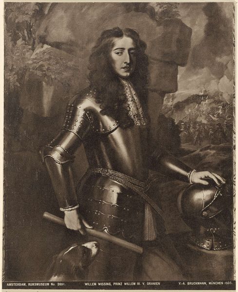 Curator: This engraving, simply titled "Portret van Willem III, prins van Oranje," is from between 1670 and 1749 and resides here at the Rijksmuseum. The artist, unfortunately, is anonymous. It presents a formal portrait in the Baroque style. Editor: Oh, the poor guy looks absolutely drowning in metal! All that heavy armor… and then those melancholy eyes. It gives off a slightly tragic air, don't you think? Like a gilded cage. Curator: Well, portraits of rulers at this time were often carefully constructed images. Armor signified military strength and leadership. But of course, what we perceive now, separated by centuries, might differ from its intended reception. Editor: True. I'm more taken by the setting. It looks like he’s in the middle of a very gloomy battlefield. Curator: The artist employed specific conventions to legitimize power. Notice the battle raging behind him; it symbolizes his role as a protector and commander. The dog at his side also contributes to this portrait as an icon of loyalty. The symbolic program communicates more about the office than the man, perhaps. Editor: So less about the human and more about the political propaganda. I do find that interesting, the way artists had to work with and within those constraints, playing a part in weaving the narratives. Did anyone really buy into all this imagery? Curator: The effect, while debated, undeniably shaped the understanding of power during that era. Prints like these helped disseminate ideas of leadership. They influenced political opinion. We see it circulated among those who had influence, and certainly influenced some. Editor: Thinking about it, I'd be sweating buckets in all that metal... and there's no exit from this job either! Though as art, the print itself is pretty special; the detail they squeezed in through engraving is incredible. Look at the line-work and the little dog is really charming. Curator: Indeed. Even through our contemporary lens, despite its primary function as a historical artifact, it resonates aesthetically. Editor: Well, I’m glad we got to delve beyond the armor and the battlefield into that interesting history. Curator: Yes, perspectives shape appreciation and deepen understanding of a visual message, especially as meanings shift across time.