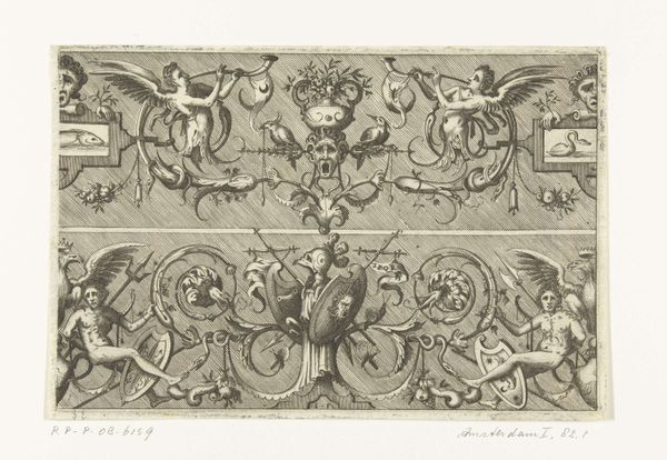 Editor: Here we have a design for a decorative frieze, estimated to be from between 1820 and 1855, attributed to an anonymous artist. It's a pencil drawing, quite linear and geometric, but also undeniably decorative. I find it a bit rigid, maybe even austere. What jumps out at you when you look at this design? Curator: Austere, yes, but also pregnant with possibility. A mere fragment of a grand vision, a whisper of neoclassicism. The unyielding geometry softened by the organic forms, like nature tentatively reclaiming the perfectly ordered world of man. Editor: I see what you mean about nature reclaiming it, with the stylized leaf and shell motifs. Curator: Precisely. It is like peering into the dreams of an architect, catching glimpses of the adornments that will eventually populate vast halls. What strikes me is how a simple line, repeated just so, can conjure such depth, such an almost palpable sense of volume. Doesn't it almost feel like we could reach out and touch it? What do you think is its intended purpose in real life? Editor: A decorative molding for the top of a wall, perhaps? Something like that, to add visual interest to a room. Curator: Maybe it is designed as a print, like for wallpaper, but one that elevates itself to be more of an intricate artwork than decoration. The more you look, the more intricacies become available. A perfect execution of geometric patternmaking with neoclassical style! What have you come to learn? Editor: I was initially unimpressed, but I am able to notice that even with its restrictions in form, the artist conveyed interesting movement and layering of objects. It almost breathes with artistic skill. Curator: Absolutely! Its seeming simplicity hides a profound understanding of form and light. An exquisite reminder that beauty often lies in the details.