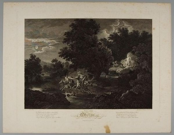 Editor: This is Johann Gottfried Schumann's "Scene from Wieland's 'Oberon'," a print depicting a dramatic landscape. It feels very staged to me. What can you tell me about the context of this image? Curator: Consider the popularity of Wieland's "Oberon" in the late 18th century. It became a powerful cultural touchstone, shaping understandings of the romantic and the fantastic. How might this image reflect the expectations of its viewers regarding stagecraft and social values? Editor: So, it's less about realistic depiction and more about reinforcing a shared cultural narrative? Curator: Precisely. The "natural" setting is a constructed image that served to evoke specific emotional and intellectual responses related to the story, reflecting its societal impact. Editor: That's fascinating. I never thought about it that way. Curator: Examining art's role in shaping cultural narratives really deepens our understanding of its significance, doesn't it?