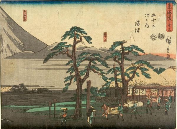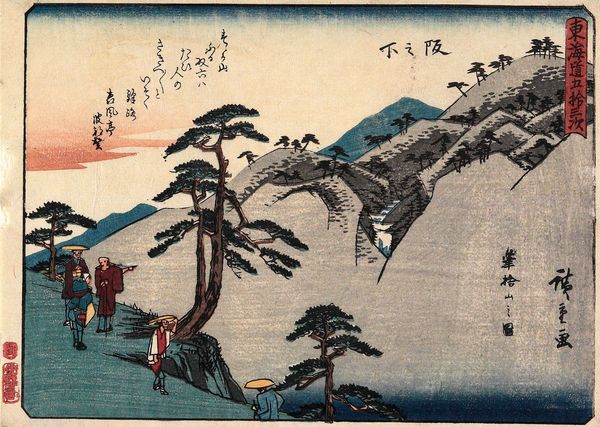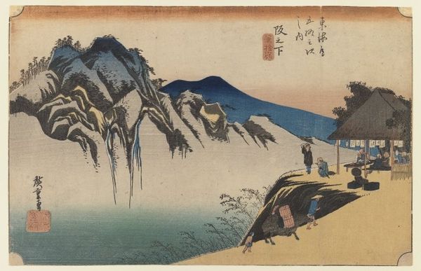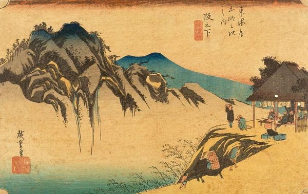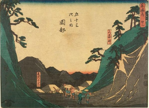Editor: This artwork, titled "TOKAIDO GOJU-SAN-TSUGI" by Utagawa Hiroshige, seems to depict a serene landscape with travelers along a mountain path. The muted colors give it a dreamy, almost nostalgic feel. What’s your take on it? Curator: It whispers stories, doesn't it? Hiroshige's landscapes aren't just about geography; they're about capturing a feeling, a fleeting moment on this famous route. Those little figures? They're us, always on a journey, always searching. The mountain looms, a silent witness, while the sky seems to be holding its breath. Editor: I can feel that! It’s like a memory. Thanks for the insight. Curator: It’s all about feelings, isn't it? Art reminds us we are all connected.