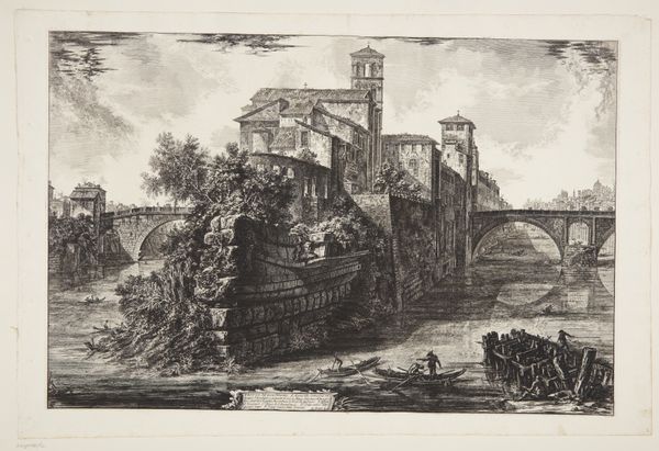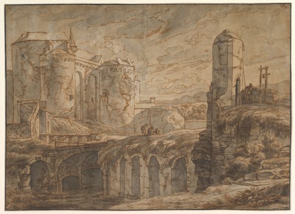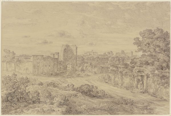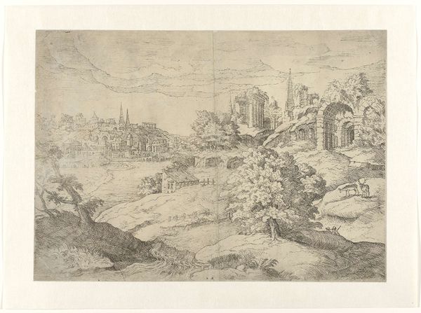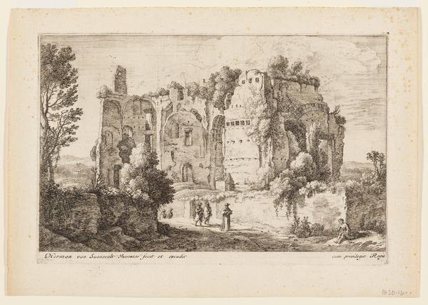 Editor: So, here we have Isaac de Moucheron’s "Poort te Tivoli," made sometime between 1677 and 1744. It's an etching, so quite delicate. The scene feels... wistful, almost dreamlike, a kind of fading memory of a place. What do you see in this work, especially regarding the symbolism embedded within? Curator: The wistfulness you describe is apt. Notice the ruinous quality of the architecture juxtaposed with the serene landscape. Ruins, symbolically, aren't simply about decay. They evoke the passage of time, the rise and fall of civilizations, a poignant meditation on human endeavors. Editor: That's interesting. The figures on the bridge, do they add to that symbolism? Curator: Absolutely. Consider them wayfarers, possibly travelers on a pilgrimage. Bridges are potent symbols themselves, connecting disparate spaces and, by extension, different states of being. They might represent a transition, perhaps a journey toward spiritual enlightenment, passing from one phase to another. Editor: So, the figures and the landscape interact... Curator: Precisely. They interact to enhance the scene. The distant mountains suggest something transcendent, eternal perhaps. Etchings are particularly interesting; as the art work is copied the symbol has a capacity to enter more aspects of visual life than perhaps paint would allow for in this time. Does that enhance your interpretation? Editor: It does. I hadn't really considered that it being a print might have broadened its cultural reach and impacted the longevity of those symbols. Thanks for helping me see the layered meanings at play here. Curator: My pleasure. The more we delve into the visual language, the richer our understanding of cultural memory becomes.