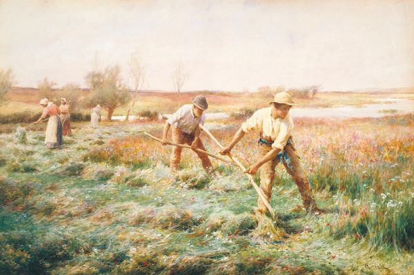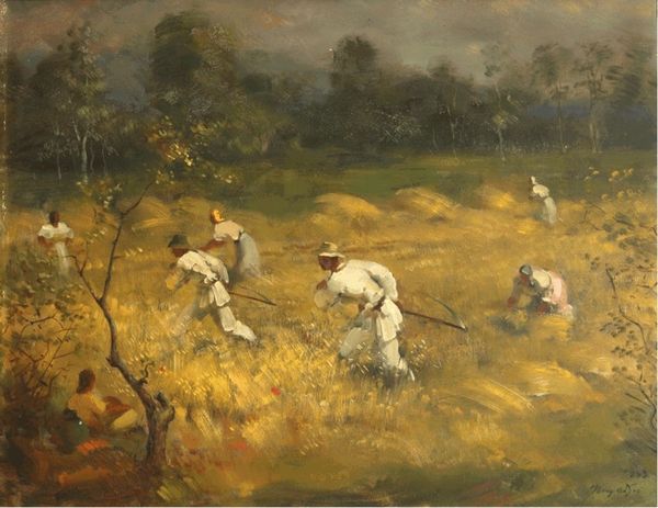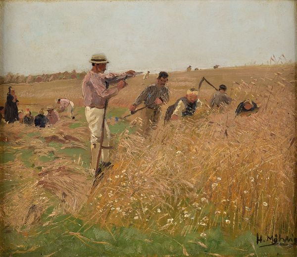 Editor: This is John Linnell’s, *A Finished Study For ‘reaping’*, created in 1858. It’s an oil painting depicting figures harvesting a wheat field under a stormy sky. The overall impression is one of impending threat combined with the timeless rhythm of agricultural labor. What strikes you when you look at this? Curator: Immediately, I notice the contrast between the golden field and the ominous sky, and I wonder about what the artist intended to convey. Are these reapers defying the coming storm, or are they a small, almost insignificant, element within the larger forces of nature? The wheat, of course, is an ancient symbol of fertility, life, and prosperity, promising abundance, even when shadowed by adversity. Editor: That's interesting. I hadn't considered the wheat itself as a symbol. The dog also feels like a symbolic element -- the companion that represents that these field hands are domestic and connected. What do you make of it? Curator: Indeed! Dogs symbolize loyalty and vigilance, archetypically guardians of the harvest, protectors of hearth and home. Given that, one cannot help but see deeper levels of this imagery. But, are the workers in harmony with the natural cycle? Or is there something else implied? What do you perceive to be the overall tone, and how does it influence the meaning? Editor: It does feel like there is a bit of tension. The workers seem diligent, almost desperate. So maybe a suggestion that even this act is never enough, that survival itself is a form of labor, as relentless as the coming storm. Curator: Yes, exactly. In essence, it is about our place in the cosmic order, reflecting on what it means to contend with life's inevitable challenges. It is precisely in the painting’s ambiguities that allow the enduring power of visual symbols to take hold of our own subjective emotional landscapes. Editor: I appreciate the way that you brought attention to the different layers of symbolic potential that add to this image. Thanks for opening my eyes to this piece's psychological impact and cultural symbolism.