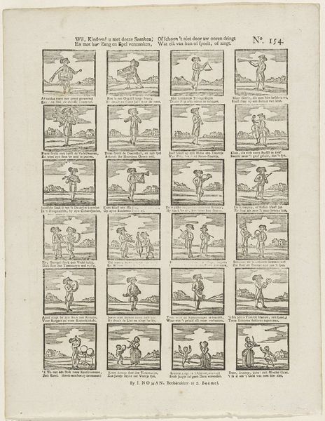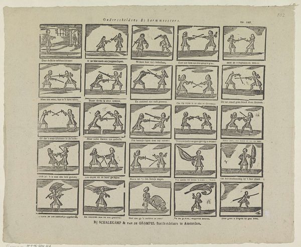 This print, "Zie hier, ô jeugd! met lust, de koordendanssery" by Johan Noman, presents a series of acrobatic feats, rendered in stark lines. Each scene is framed, creating a grid-like structure that organizes the chaotic energy of the performers. The figures are depicted mid-action, their bodies contorted and balanced, challenging our perception of physical limits. The use of line is particularly striking. Noman employs a dense network of hatching to create depth and shadow, yet this also flattens the image, emphasizing the graphic quality of the print. The contrast between the dark lines and the blank paper heightens the sense of dynamism. Consider how this formal arrangement mirrors the cultural context of performance. The print captures a moment of spectacle, inviting viewers to marvel at the skill and daring of the acrobats. It’s in this interplay between the ordered structure of the composition and the unruly nature of the subject matter that the print finds its power.