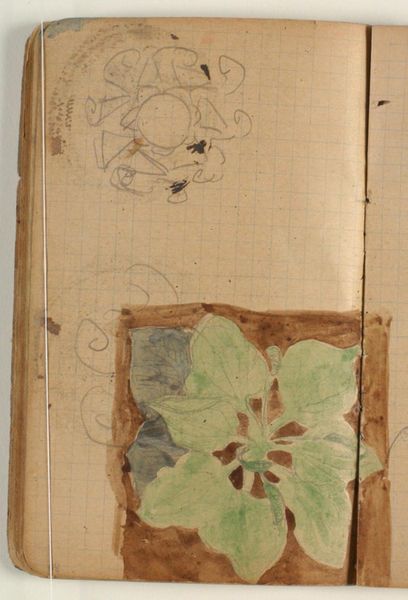 Editor: So, here we have Niels Larsen Stevns's "Havstudie, samt skitser af planter og planteornamentik" from 1906. It’s a drawing rendered with colored pencils. I'm immediately drawn to how it resembles a page torn from a naturalist’s field journal; quite subdued with pockets of intense colour. What stands out to you? Curator: Well, I think it's important to consider the cultural context in which Stevns was creating this work. Early 20th-century art was grappling with the relationship between industrialization and nature, often exploring themes of national identity tied to the land. This sketchbook page is very personal, yet it alludes to larger issues: How do we, as a society, document and interact with the natural world? Notice how the sketchbook page grid imposes order on nature’s supposed chaos. Editor: That's interesting! The grid adds a layer of… almost scientific scrutiny to something that could otherwise be just beautiful. Curator: Exactly. And it's not just a passive observation. It feels like an attempt to classify, to control even. Do you think there's a hint of tension in the contrast between the artist's expressive mark-making and this underlying grid? A power dynamic perhaps, between observer and observed? Editor: I can see that. There's freedom in the sketched lines, yet confinement in the grid, an odd pairing. So the act of sketching is inherently a power dynamic, even when it's just meant as a study? Curator: I would argue yes. Our interpretation of nature is never neutral. And for Stevns, his studies intersect questions of artistic creation and control, both visually and ideologically. Editor: Wow. I'll never look at another nature sketch the same way again. Thank you! Curator: And thank you for offering me a fresh perspective on how such studies echo larger debates around representation, control, and the evolving human-nature relationship.