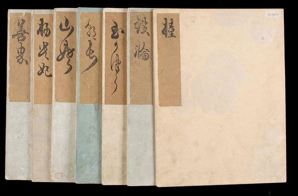 Editor: Here we have Yoshida Hanbei's "Five Women Who Loved Love", a set of five illustrated books. I find the covers intriguing; the repeating geometric pattern and faded illustrations give them an almost secretive quality. What can you tell me about the socio-political context of such a work? Curator: These books, part of the Ukiyo-e tradition, offered a glimpse into the lives, loves, and sometimes, the scandals of women in Edo-period Japan. Did the authorities view such depictions as celebratory or subversive? Editor: That's a good question. I hadn't considered how authorities might react to such intimate stories being shared publicly. Curator: Exactly. The censorship laws of the time played a significant role in shaping the content and style of these illustrations. Understanding that push and pull is crucial to interpreting this work. It reveals how social mores were both reflected and challenged through art. Editor: That's really interesting. I’ll definitely consider that context when I look at other Ukiyo-e works now. Curator: Indeed, considering the public role of art illuminates the politics of imagery, doesn't it?