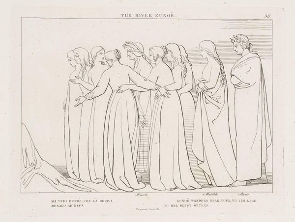 Curator: Welcome. Today, we're looking at John Flaxman's "The Vestibule of Purgatory," currently held in the Tate Collections. Editor: It's stark, isn't it? All these figures rendered in such fine, almost fragile lines. There's a raw, almost unsettling quality to the image. Curator: Flaxman's work often engaged with classical forms and moral narratives. This piece illustrates Dante's journey, reflecting societal anxieties regarding sin and redemption through its visual representation. Editor: And think about the labor! These lines, likely etched into metal, then printed. The social context of printmaking, the reproducibility... It democratizes the terror. Curator: Absolutely. Flaxman used his art to engage the public, using accessible imagery to convey complex theological ideas. Editor: The materiality enhances its message. Its starkness makes me reflect on labor and the politics of representation. Curator: A brilliant intersection of artistic technique and social commentary. Editor: Yes, it leaves me pondering the complex relationship between art, production, and fear.
