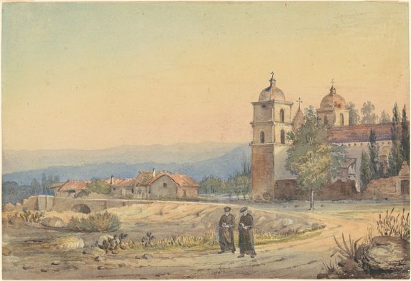 Curator: This is Charles Herbert's watercolor, "Street Near Simplon Village," currently housed at the Harvard Art Museums. Editor: It feels incredibly peaceful; the soft light and muted colors create a sense of quiet solitude. Curator: Herbert, an English artist, often depicted European landscapes. Here, he captures a small village, likely in Switzerland, with its sturdy buildings and pastoral scene. It's a romantic vision, isn't it? Editor: Romantic, perhaps, but also idealized. Look at the woman and child with their sheep; it's a picture of rural simplicity that overlooks the labor and lived realities of such communities. I wonder, what was Herbert's relationship to these places? Curator: Indeed. The painting reveals more about the artistic conventions of the era than the specifics of the village itself. Herbert likely aimed to evoke a sense of timeless beauty, fitting within the established market for landscape watercolors. Editor: Right. Though, I still appreciate how the architecture and natural environment blend together. There's a harmony, even if it's a constructed one. Curator: Ultimately, it prompts us to consider the complexities of landscape art and whose stories are privileged within its representation. Editor: Yes, and thinking about whose perspectives are missing only enriches my viewing experience.