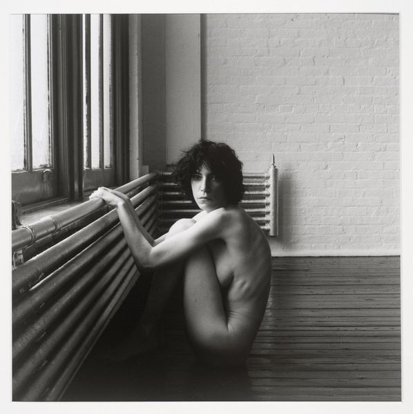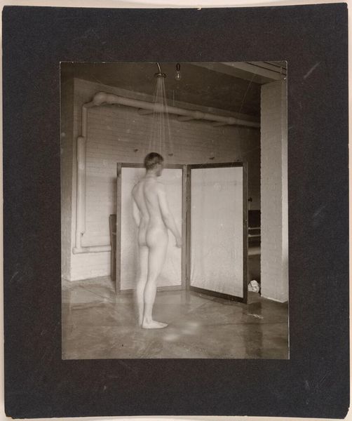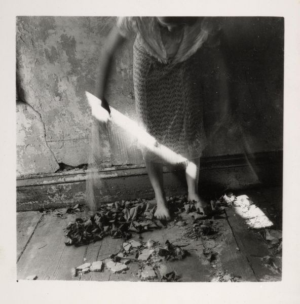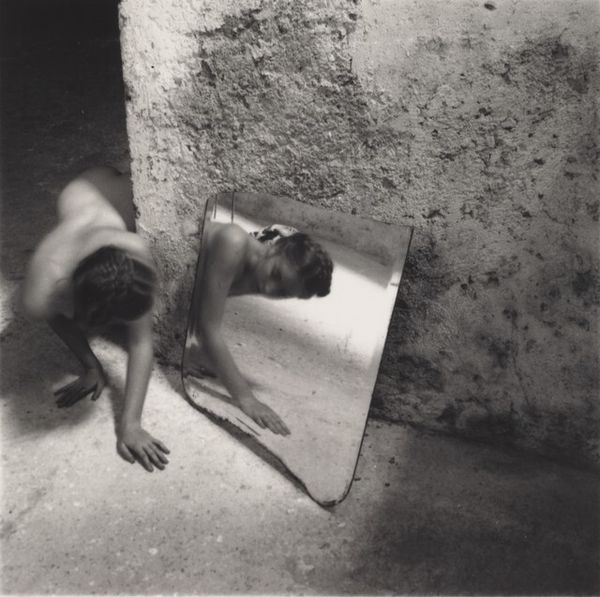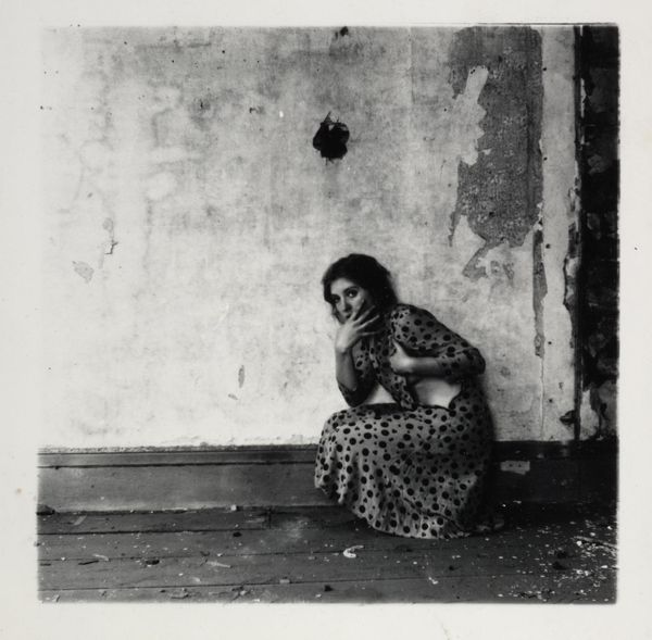 Curator: The starkness is arresting. It feels like a Victorian ghost story. Editor: Here we have Francesca Woodman's photograph, "Providence, Rhode Island, 1976," now held in the Tate Collections. Look at the distressed state of that interior. Curator: The peeling paint, the bare bulb socket... they become symbols of decay, almost a metaphor for the figure's vulnerability. Editor: Woodman often used these spaces, drawn to the materiality of neglect. The labor needed to maintain these buildings, or the lack thereof, speaks volumes. Curator: And the shadow! The elongated doppelganger on the floor suggests a fractured self, an anxiety about identity. It's so potent. Editor: She was acutely aware of the photographic process itself—the chemicals, the darkroom alchemy. It all served her self-portraiture. Curator: The shadow becomes another figure. It hints at something haunting. Editor: Woodman's short life was a fierce interrogation of making the female body visible through the labor of photographic materials. It leaves a lasting impact, doesn't it? Curator: Yes, it does. It's a chilling reminder of the power of image.