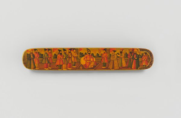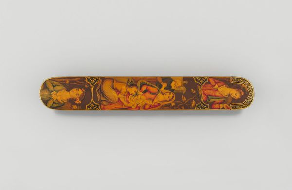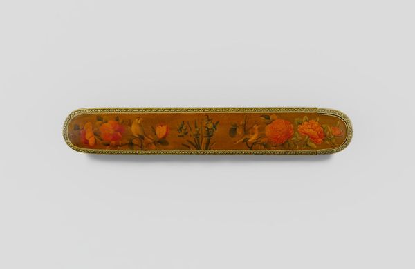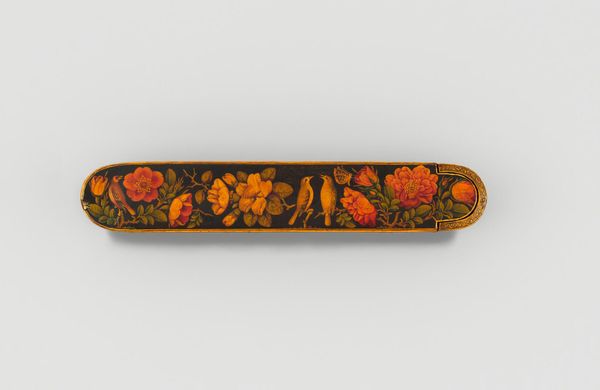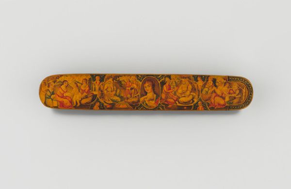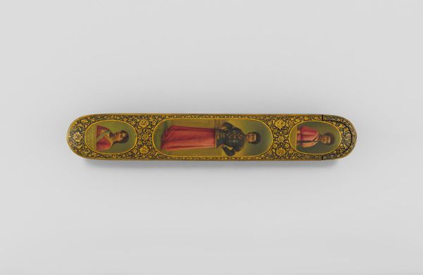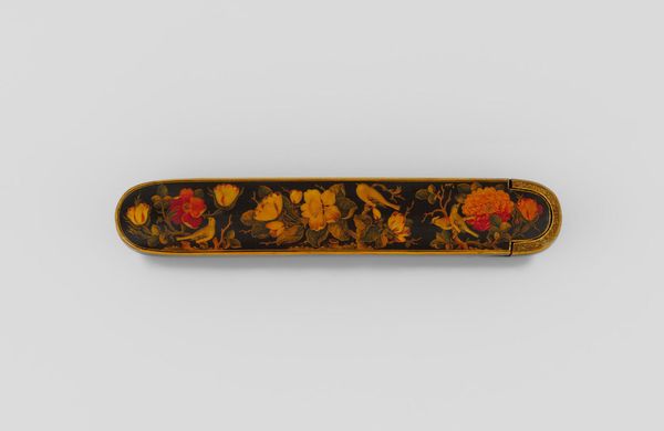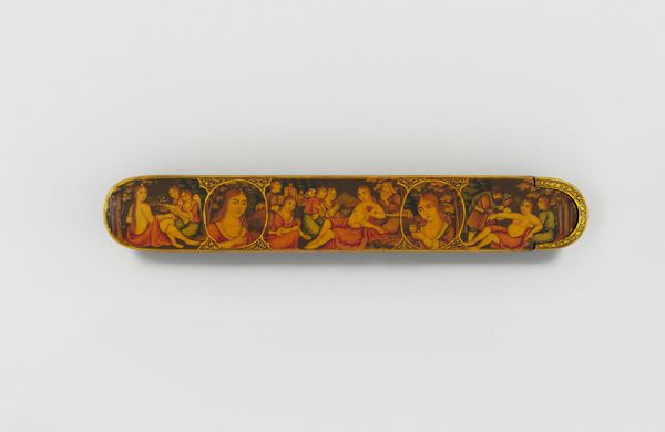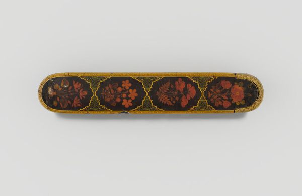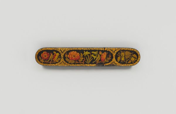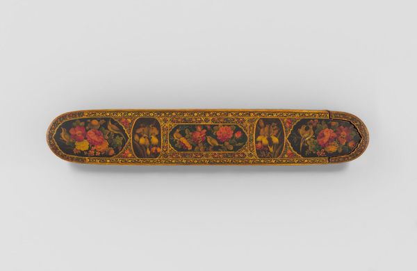 Editor: So, this is a Pen Box with Portrait Medallions on Floral Ground by Haji Muhammad. It’s at the Harvard Art Museums, and it really strikes me how much care went into something so utilitarian. What can you tell me about it? Curator: Looking at this pen box, I'm drawn to the labor involved. The process of creating lacquerware, meticulously painting the floral ground and portraits – it speaks to a culture where even everyday objects were elevated through skilled craftsmanship. Who was this Haji Muhammad, and who was consuming this piece? Editor: That’s a really good point. I hadn’t thought about how it bridges art and craft in that way. Thanks! Curator: And what can we understand about the society, through its consumption and production?