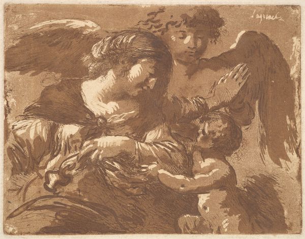 Editor: So, this is "Jupiter og Antiope," made sometime between 1625 and 1677. The museum lists the artist as Heinrich Dittmers, and the medium is drawing – a combination of pastel and what looks like oil. I'm struck by the… almost predatory gaze of Jupiter. How should we interpret it? Curator: That's a perceptive reading. Think about Jupiter, or Zeus in the Greek pantheon. He embodies power, but also embodies *desire* – often expressed through trickery. Consider Antiope’s slumber. What does sleep represent symbolically? Editor: Vulnerability, maybe? Lack of control? Curator: Precisely. The eroticism isn't just about nudity; it's about that power dynamic, that unveiling of vulnerability. See the bow and quiver discarded at her feet. Consider also the history of portraying female nudes by male artists; do they truly reflect female agency, or perpetuate societal objectification? Editor: That adds a whole new layer. It's not just a mythological scene; it reflects power and its abuse through art itself. Curator: Indeed. And look how Dittmers renders Jupiter - his gaze is almost grotesque. It could be argued that Dittmers comments on unchecked authority. Do you notice any contrasting symbols? Editor: I hadn't noticed… the drape? It feels luxurious but could emphasize how Antiope's agency has been reduced. Thanks for shedding light on the symbolism, it really reframed my understanding. Curator: It's fascinating how symbols can layer meaning across centuries and cultures. Analyzing images using psychology and social cues expands our perspectives.