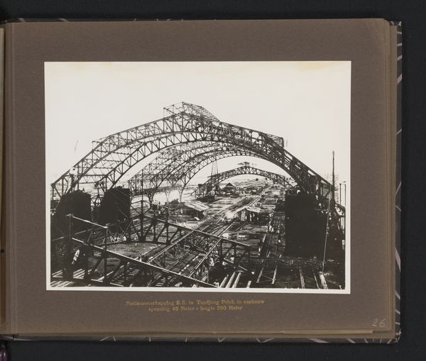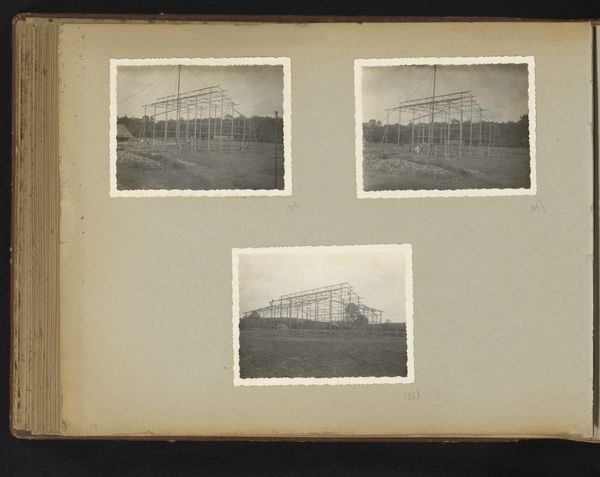 This photograph, "Theefabriek Kertamanah gebouwd door Machinefabriek Braat Soerabaia 1934", was created in 1934 by an anonymous photographer. It’s a black and white image of a factory under construction. What grabs me first is the skeletal quality of the structure; it's all lines and angles, an open framework against the landscape. The texture is fascinating. The grainy quality of the photograph feels almost tactile, like you could reach out and touch the rough surfaces of the metal and wood. I am drawn to the ordered chaos of the scaffolding. The way the photographer captured the light filtering through the structure, creating a play of shadows, adds another layer of depth. It’s as if they’re not just documenting a building, but also the process of its becoming. This piece reminds me a little of Bernd and Hilla Becher’s photographs of industrial structures – that same detached, almost clinical approach to capturing architectural forms. Ultimately, it's a celebration of human ingenuity and the beauty that can be found even in the most utilitarian of subjects.