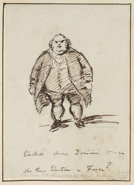 Editor: Here we have a pen engraving and print called "Major, Baron Pechlin," made between 1829 and 1899 by H.P. Hansen. There’s a satirical quality to the figure depicted, but also a clear statement about power and status in its composition. What social dynamics do you see at play? Curator: This work definitely places itself within the context of social commentary and class critique. Consider the subject's prominent belly, contrasted with his expensive attire. Hansen seems to be probing the privileges and excesses associated with the aristocracy, right? Do you feel a sense of empathy or ridicule directed towards the Baron? Editor: I lean towards ridicule. The exaggerated features and pose give it a caricatured feel, almost mocking his authority. I wonder if the artist intended to challenge the traditional, idealized portraits of the elite. Curator: Precisely. Hansen subverts those traditional representations. The Baron’s body language, his hands casually stuffed in his pockets, it all conveys a sort of detached arrogance. This subversion of the dignified portrait serves as a powerful indictment of a social order based on inherited power. Does this piece suggest a broader questioning of social norms during the time it was made? Editor: It seems like it does. It hints at a burgeoning critique of the elite, aligning perhaps with calls for social reform, even revolution that ran throughout Europe during the period it was made. Curator: Absolutely. By stripping away the glorification typically afforded to the upper class, Hansen invites us to reflect on the disparities and inequalities inherent in the social structures of the 19th century. He really urges us to be active viewers and thinkers. Editor: I see how looking beyond the surface representation opens up the conversation about social and political power. Curator: It really reveals how art can be a powerful tool to reflect on the cultural biases that existed when a piece was made and consider the historical legacies which might carry them to our day.