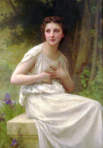 Curator: I’m struck by the luminous quality of this painting. It feels soft, almost dreamlike. Editor: That’s "Earrings," completed in 1891 by William Bouguereau. It's an oil painting, and a prime example of his Academic style, where realism is infused with a kind of idealized beauty. Curator: Idealized is definitely the word. She looks almost ethereal, that sheer white fabric clinging so perfectly. But her gaze… there’s a slight downward turn, almost a shadow of melancholy. Editor: Absolutely. While it presents this almost flawless image, we have to acknowledge the societal expectations projected onto women at the time. Bouguereau’s popularity coincided with the rise of bourgeois values, shaping how women were seen and how they saw themselves. Curator: The "cult of domesticity," certainly, with its emphasis on female purity and beauty. It's fascinating how his work both reflects and perhaps even reinforces these notions, positioning women within this limited social sphere. Editor: And the landscape setting contributes. It’s nature, but a tamed, romanticized version. There is this subtle yet definite symbolism of women being linked to nature. It highlights her innocence, beauty, and fragility as something delicate and in need of care. What do you think about that pose? She is sort of shyly holding her earrings… Curator: Yes, she almost seems caught in a private moment, her fingers delicately touching one of the eponymous earrings. It draws the eye, that pop of red against the otherwise muted palette. But the question is: what do the earrings symbolize for her? Perhaps this portrait was commissioned. Who was she? Her history, desires and the socio-economic pressures on her are lost. Editor: Lost, perhaps, but not entirely absent. We can use art like this to initiate important dialogues. The more we reflect on those issues from an intersectional perspective, the more apparent are the cultural assumptions and the politics in image creation. Curator: A crucial point. "Earrings", though seemingly straightforward, speaks volumes about its time and asks us to critically assess our own present. Editor: I agree. Hopefully, such conversations encourage future artistic representations that encompass a diverse and liberated image of people within social spaces.