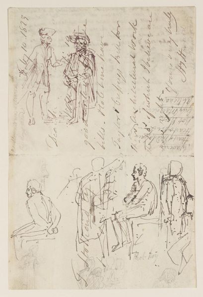 Editor: This is Washington Allston's "Sketches of Napoleon, President Willard, and Mrs. Timothy Waterhouse," dimensions roughly 16 by 12 inches. It’s a pen and ink drawing filled with caricatures. I'm struck by the way Allston combines studies of different people onto a single sheet. What can you tell me about its public reception, if any? Curator: This wasn't really made for public reception, at least not in the way we think about it now. These sketches likely served as preliminary studies. Note the range of figures depicted: a fallen emperor, a college president, and a local woman. Allston was interested in observing and capturing different types. Editor: So, it's about the act of observing society? Curator: Precisely. Consider the social commentary inherent in juxtaposing these figures. What does it say about Allston’s world that he places them all on equal footing in his sketchbook? It makes you wonder about his views on power and status, doesn’t it? Editor: It does! The social dynamics are really interesting to consider, even in a sketch. Curator: Exactly. And that's why even seemingly simple sketches can give us insights into the artist’s world and the broader culture.