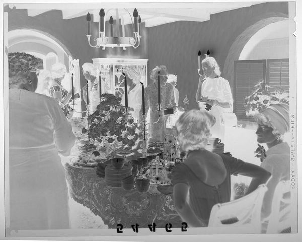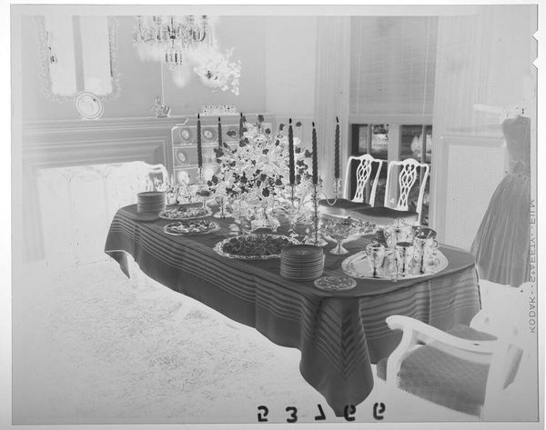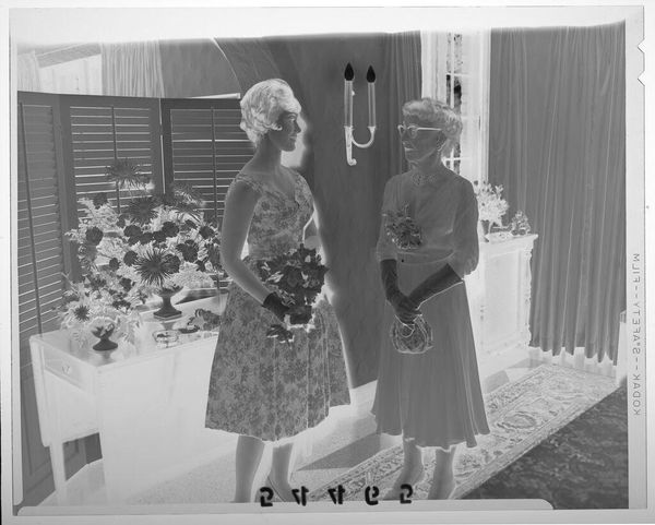 Curator: This photograph, by Martin Schweig, captures a young woman at what appears to be her debutante party. The image size is roughly 4x5 inches. Editor: It’s startling—eerie almost. The inverted tones give it a ghostly quality, and the floral arrangements feel overwhelming. What do you make of it? Curator: The flowers, especially en masse, often symbolize beauty, youth, and celebration. But consider the context. Debutante balls are highly ritualized events marking a girl's entry into society. They reflect societal expectations around femininity and status. Editor: Yes, I see the piano—an instrument associated with women in domestic settings, but also artistry and accomplishment. It’s a fascinating blend of tradition and aspiration. Curator: And the inverted image perhaps hints at the artifice and the constructed nature of these social performances. What's revealed, and what's concealed? Editor: It offers an interesting commentary on the socio-political pressures placed on women during that era. Makes you think about all the unseen power dynamics at play. Curator: Indeed. This seemingly simple portrait opens a window into a complex world of symbols and social expectations.