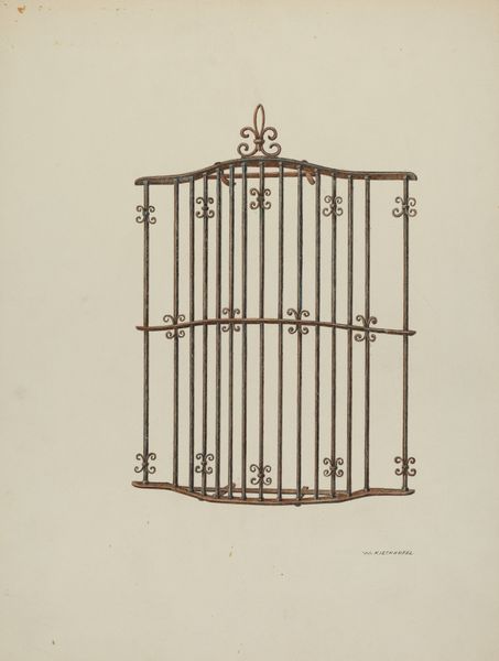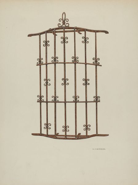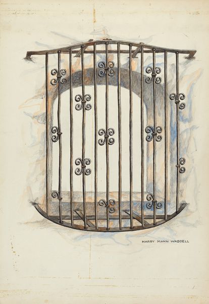This drawing of an iron grille was made by William Kieckhofel. Kieckhofel was active during a time of significant industrial change, and ironwork like this often reflects both practical and aesthetic concerns. Consider the duality inherent in a grille. It's a barrier, yet it also offers a view. This tension speaks to ideas of inclusion and exclusion, safety and confinement. In what ways does the wrought iron both protect and limit the space it occupies? The decorative elements soften the industrial nature of the iron, almost as if to domesticate it. Perhaps this reflects a societal desire to reconcile industrial progress with traditional craftsmanship. The design elements also suggest a cultural identity; is it European, Spanish, or perhaps a blend? This blending can represent the complex interplay of cultures and histories present in American society. Think about the stories this grille could tell, the spaces it has defined, and the lives it has touched.