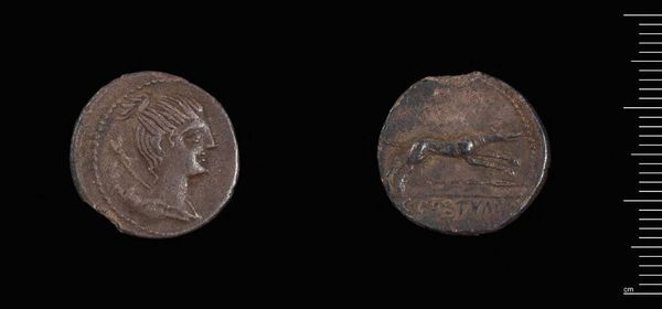 Curator: So, here we have a Denarius, a silver coin issued by none other than Julius Caesar in Hispania. It's a tiny thing, only 3.82 grams. What’s your first impression? Editor: Immediate? The weight of history. I imagine all the hands this passed through, the transactions it witnessed. The sheer materiality is overwhelming. Curator: Exactly! And think of the ego needed to put your own image on currency! A statement about power, control, and a kind of immortality. Editor: Well, it’s also about standardizing value, facilitating trade. The *process* of minting these, the labor involved, is a testament to Roman administrative prowess. Curator: I suppose. But there's something almost… haunting about seeing Caesar's face staring back at you, across millennia, isn't there? Editor: I'm more fascinated by the distribution networks, the economic flows these coins represent. It is all a product of material and social interactions. Curator: So, more about the what and less about the who? Fair enough. It remains a powerful artifact regardless of what we read into it, wouldn't you say? Editor: Indeed. It is a tangible link to the past, ready for anyone to make their own story.