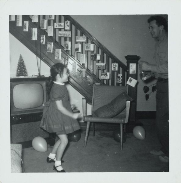 Curator: This gelatin silver print, "Untitled (Man in living room with fishing pole)," dates from around 1960 and is by an anonymous artist. My first thought? What an unexpected, peculiar sight—the fellow looks completely out of place. Editor: Utterly. There’s such a charming dissonance, isn't there? This figure, equipped for the great outdoors, stands awkwardly in this domestic setting. I keep searching for an ironic angle...or something deeper than it is. Curator: Perhaps it’s a whimsical take on the eternal pull between nature and domesticity. That fishing rod mimics the TV antennae, maybe symbolizing the clash of experiences competing for this guy's attention... I imagine. Editor: Yes, the juxtaposition of the painting hung over the fireplace and the TV beside it offers the old world and new worlds competing for attention. He's geared for angling yet seemingly nowhere near a stream. There's almost a comedic, everyday heroism on display. Like Don Quixote tilting at windmills, only, you know, with trout. Curator: True, but to what end? There’s something profoundly unsettling, and I hate the feeling that a sense of emptiness is lurking. The bland room and that ghostly white TV set look depressing in black and white. This all feels too deliberate to simply be kitsch, no? Editor: Well, icons of fishing gear, rods, hip waders – they often signify journeys, both literal and spiritual, connecting us back to traditions and ideas of sustenance. But placed in this sterile zone, it mocks the old myths while desperately clinging to an idealized past... like, it's a simulation of meaning. Curator: Maybe that is the magic, or lack thereof. What seems random suddenly gains weight under our probing… I leave this photograph seeing things not actually present, and feeling uneasy and displaced from this moment forward. I think that is a victory of a certain type of conceptual, emotional impact. Editor: I am left questioning authenticity in our own lives: are we fully engaged, or merely performing roles that resonate through cultural memory, hoping we have not become completely adrift and displaced? An excellent point on which to ponder leaving this peculiar, affecting image behind.