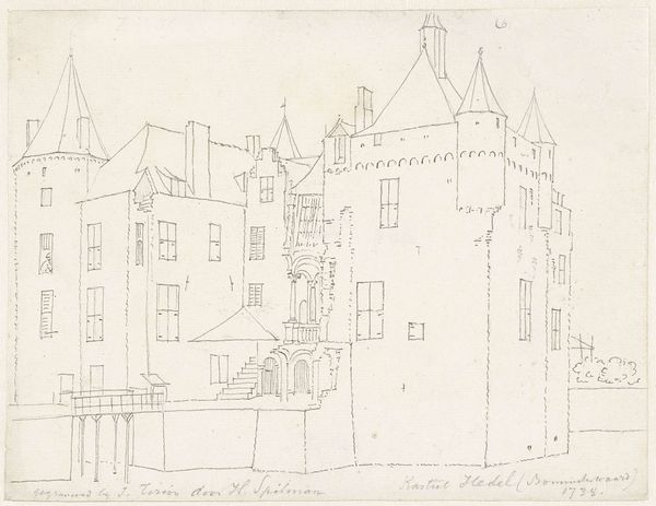 Roelant Roghman made this drawing of Lokhorst or Oud-Teilingen using graphite on paper sometime in the 17th century. Roghman's choice of graphite as a medium is significant. It’s a material that offers a direct, unmediated connection between the artist's hand and the paper's surface, allowing for a remarkable sensitivity to the material qualities of the castle itself. The softness of graphite allows for subtle gradations of tone, capturing the way light plays across the stone and brick of the building. Look at the variations in line weight used to describe the architecture, from the broad strokes defining the overall form to the delicate hatching that suggests texture and depth. This technique shows a considered engagement with the medium's potential to evoke atmosphere. The drawing shows us not just a building, but also, in the very act of its making, the traces of Roghman’s labor and his vision. It challenges us to think about the act of drawing itself as a form of material engagement.