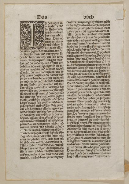Editor: Here we have a page from an anonymous, undated book, featuring a woodcut print titled "Moses Receiving and Giving the Tablets of the Law" from the Harvard Art Museums. The vibrant colors within the initial "D" draw my eye immediately. What do you see in this piece? Curator: Well, the illuminated initial itself functions as a visual symbol. The letter frames the narrative of Moses, linking him to the divine word. The border is teeming with foliage, suggesting a world blessed with abundance due to adherence to God’s law. Do you see how that relates to cultural memory? Editor: So, the image serves as a reminder of the covenant between God and the Israelites, promising prosperity in exchange for obedience? Curator: Precisely. This isn't just a pretty picture; it’s a condensed theological argument embedded in a visual form, constantly reminding the viewer of their cultural and religious obligations. Editor: I see it now! The symbols carry so much more weight than I initially thought. Curator: Yes, and understanding these symbols helps us connect with the past.