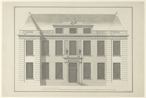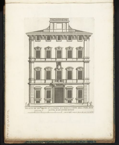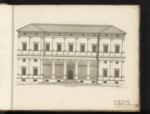 Editor: Here we have Nicolaes Ryckmans' engraving from 1622, "Opstand van de façade van de villa Pallavicino delle Peschiere te Genua." It's strikingly symmetrical, almost like an architectural blueprint. What stands out to you when you look at it? Curator: The precise linearity, the relentless geometric arrangement, presents us with a powerful essay in controlled space. Consider the stark contrast between the solid, shaded rectangular forms of the windows and the graceful curves of the arches. How does that tension speak to you? Editor: It creates a sort of restrained energy. The arches want to flow, but they're held in check by all those straight lines. Is that tension a feature of Baroque style architecture generally? Curator: Indeed, the tension arises from the push-and-pull dynamic between classical ideals of order and the emerging Baroque aesthetic. Look closely at the pillars - how do their placement and proportional relationships dictate the reading of the façade? Editor: They create rhythm, separating the windows into distinct units, but still adhering to the strict symmetry. So, it's not just decorative; it structures how we perceive the building. It seems as if the architect wanted to present an almost mathematical elevation. Curator: Precisely. Ryckmans, through the clarity of his engraving, dissects and presents to us the very logic underpinning the architectural design. What thoughts does that provoke? Editor: I suppose I hadn't considered how much of an argument a simple building façade could make. This makes me want to seek out more architectural engravings. Curator: Yes. It invites us to decode not just the building, but the mindset that conceived it. We begin to grasp that a well-ordered facade embodies ideals.
