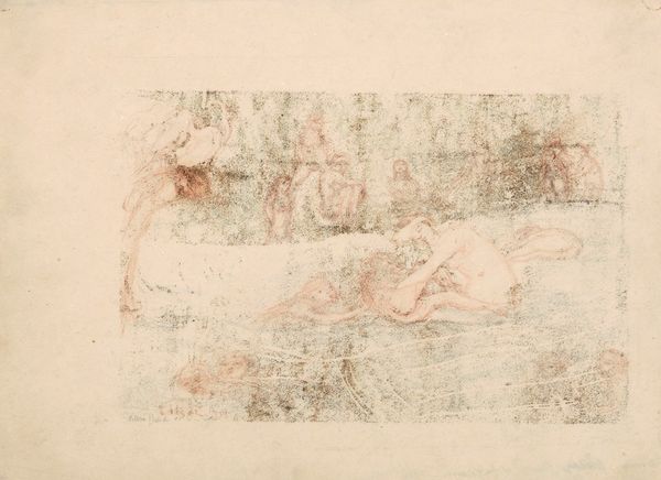 Curator: I am immediately struck by the fragility, the utter ephemerality of this image. Editor: Here we have James Abbott McNeill Whistler's "Draped Figure Reclining," an etching from 1892. It's quite small. What are you seeing that evokes such a strong response? Curator: It's the linework, so delicate it seems a breath could erase it. And the almost washed-out colors lend a dreamy, ethereal quality. I find that remarkable. Editor: The lines indeed carry a heavy weight as Whistler deliberately explored tonal relationships and states of being. Consider also the historical context. At this time, women’s labor in the home often goes unrecognized, the softness and repose may provide a critique of this very process, especially during the fin de siècle, which can provide the impression of effortlessness, whereas making such a piece and being in such domestic settings has social implications. Curator: The subject, relaxed on what appears to be a chaise lounge, doesn’t appear at all carefree to me. In fact I feel the piece may portray a quiet form of protest that can perhaps challenge perceptions of gender and status. This intimate space, this quiet pose, can imply to us all that this interior can offer something other than our initial views might assume. Editor: I understand the reading, however the formal components point in a different direction, perhaps suggesting that any narrative function must go in hand with a critical understanding of the tonal nuances within the picture, while offering complexity. Curator: Whistler uses etching, a traditionally reproductive medium, and transforms it into something uniquely expressive. Etchings could be replicated on paper using his process for an affordable price. That shifts notions about what kind of image this is. The material context of its making feels very intentional, therefore his access becomes accessible to an increasing audience that would not have been possible years prior. Editor: But it also enhances the intimacy. Think about the relationship of the artist and the plate, then consider how they materialize themselves in each print. Whistler brings an understanding of beauty to something that once produced functional results, using the technique in many novel and unexpected ways. Curator: Exactly. What do you take away from the material and its message now, given all of our observations about the image and Whistler’s work? Editor: Ultimately, an incredible work that demands repeated looks. Every return invites a richer perspective than before, an invitation to look deeply into art's forms.