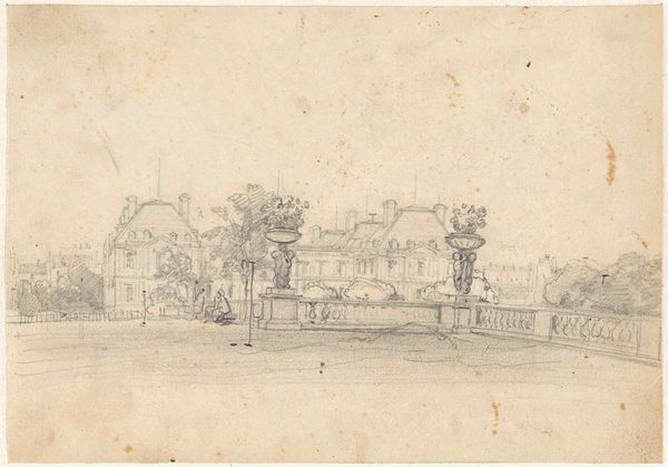 Curator: This is "Italiaans landschap" or "Italian Landscape" by Elias van Nijmegen, created sometime between 1677 and 1755. The piece is a drawing, primarily executed in pencil. Editor: My first thought is that this work has an incredibly muted quality. The pencil lends itself to a dreamlike depiction of a city in the distance, almost like a faded memory. Curator: It's fascinating to consider the choice of pencil as a medium here. Rather than oil or watercolor, the artist selected a relatively humble material. Pencil drawings often served as studies or preparatory sketches for larger works. It makes you wonder about Van Nijmegen's process: was this meant to be a finished work or a step towards something more elaborate? Editor: Absolutely! I'm also struck by the symbols of history. Those buildings in the distance evoke the grand narratives of empires and classical knowledge, reduced here to faint, almost ephemeral, outlines. Curator: You're right. There's a layering of time happening. Van Nijmegen, a Dutch artist, is depicting an Italian landscape referencing antiquity through this specific handling of humble materials. The economic exchange embedded in his travel and work also tells a story of craft distribution. How the artist learned and adapted these drawing techniques and the availability of such materials tells you also something of his formation and market opportunities. Editor: And those faint lines create a sense of distance, both physical and temporal. It's as though the artist is showing us not just a place but a reflection on the weight of history and culture. A place burdened by classical aspirations. Curator: I wonder if he directly drew on the motif and style of renaissance painters like Leonardo. If we consider what art students learn from their atelier and how the knowledge passes from generations, maybe it shows how they internalized certain styles through working with these techniques. Editor: It almost invites us to contemplate the fragility of these grand narratives when filtered through personal memory and experience, doesn't it? It's interesting what choices he made with this accessible material. Curator: Indeed. Examining Van Nijmegen’s “Italian Landscape” we learn something about its role in the creative process of 17th and 18th century Dutch masters as they engaged with an expanding visual world. Editor: Agreed, a wonderful peek into a moment of personal reflection and broader historical engagement.