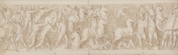 This drawing of a battle scene was made by an anonymous artist, with pen and brown ink with brown wash over graphite on cream laid paper. The composition, with a central figure heroically mounted on a rearing horse, draws upon a long tradition of equestrian portraiture used to celebrate military leaders. This iconography was especially popular during the Renaissance and Baroque periods in Europe when powerful families and individuals sought to solidify their authority through art. The lack of precise dating and the artist's anonymity invite speculation. Was it a preparatory sketch for a larger history painting, intended to adorn a palace or public building? Or perhaps it was produced within the walls of an academy. By delving into the visual codes and historical associations, and by investigating the patronage systems and artistic institutions of its time, we can gain a deeper understanding of its meaning. The historian's role is to uncover these layers of context, revealing the complex interplay between artistic creation and social power.