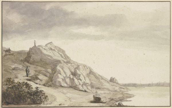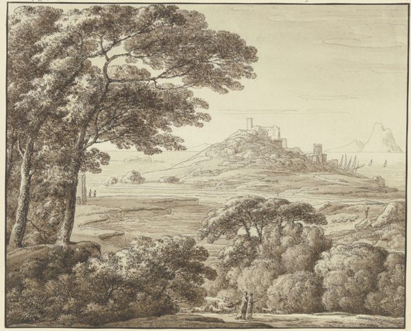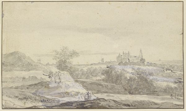 Curator: This work, skillfully rendered with pencil, ink, and chalk on paper, is titled "Landschaft, links ein Turm, einige Mauern und Häuser, rechts Gebüsch, Fernsicht," attributed to Anthonie Waterloo. The landscape, though seemingly simple, pulls you in. Editor: It certainly does. My initial response is one of quiet solitude. The delicate shading and muted tones evoke a sense of calmness and almost melancholy. It’s as if time is standing still in this scene. Curator: That's a wonderful observation. The image appears to date from the 17th century, during the Baroque period, when landscape art was developing an emphasis on detailed observation and conveying a sense of the sublime. Waterloos contributions, however, lay more in a humanization of the environment. He embraced landscape art, especially scenes like this one that feel bucolic and relatable. Editor: Yes, relatable but, tell me, are these actual places represented, or impressions of life in that period? I’m thinking about how these depictions could also speak to power dynamics within that environment. Are we meant to see an idealized, perhaps sanitized, version of rural life? Curator: Those are key points to unpack, especially with the perspective of contemporary theory in mind. While this could reflect real elements, the picturesque composition and serene mood are constructed. Consider who had access to land and resources in the 17th century, and who is omitted or overlooked in the image. The artwork does invite reflection about rural realities beyond what the artist shows. Editor: I agree, it begs us to ask 'whose reality is represented?' and 'whose is conveniently left out?' We cannot merely appreciate the aesthetic appeal without questioning the narrative it promotes. Curator: I think your reading enriches our understanding, recognizing both the artwork's inherent beauty, the masterful strokes, and the potential power dynamics present or, as you suggest, purposely absent within the artist’s chosen framework. Editor: And it reminds us that art never exists in a vacuum but is constantly shaped and reshaped by forces from within the artist’s environment and long after, by the viewers that analyze and reflect upon it.