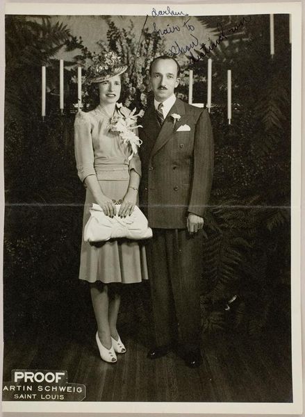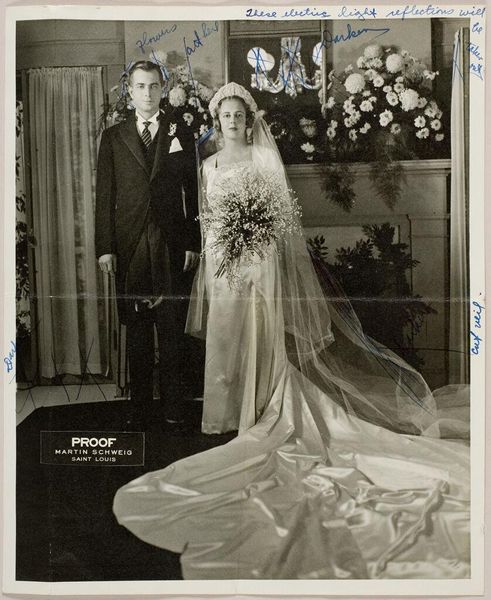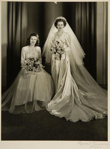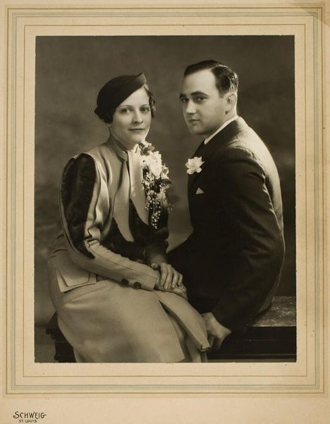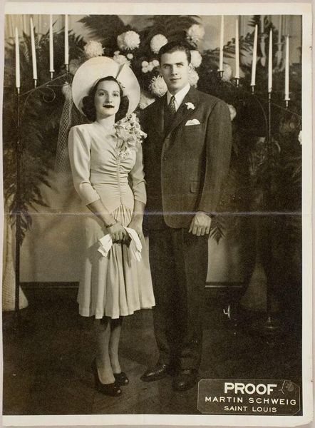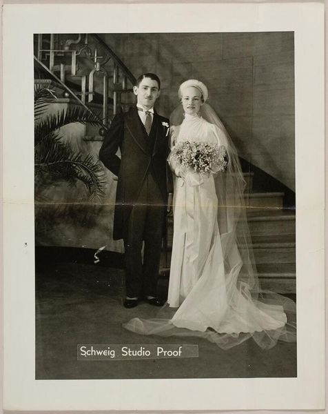 Curator: Looking at this photograph, I immediately feel a sense of poised anticipation, like a held breath before a great adventure. Editor: Indeed. What we have here is an untitled photograph by Martin Schweig, held in the Harvard Art Museums, depicting a bride and groom. Curator: There's a wonderful contrast between the delicate lace of the bride's gown and the formal attire of the groom. It speaks volumes, doesn't it? Editor: It does, especially when considering societal expectations around gender roles and marriage at the time. The backdrop, those stark vertical lines, almost feel like the bars of a cage. Curator: Or perhaps the path forward? I find it rather elegant. There’s something timeless in their expressions, a shared hope perhaps. Editor: A hope built on structures that often limit women’s autonomy. But maybe this couple redefines that structure, together. Curator: Maybe they do, making the photo less a portrait of a couple but a meditation on partnership. Editor: An enduring paradox, isn't it? The promise of love, entwined with the realities of societal expectations.