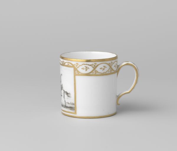 This delicate cup, crafted by Adrianus Johannes Bik, presents a study in contrasts and complements. The pristine white porcelain serves as a ground for the intricate, gilded details that encircle it. Notice the gold, how it defines the cup’s lip and base, creating a sense of contained opulence. The monochromatic portraiture is framed by festoons of golden drapery, hinting at celebration and honour. The inscription, rendered in the same gleaming gold, speaks to the cup's commemorative function, likely celebrating royalty or a significant alliance. The cup invites us to reflect on the semiotics of power and commemoration embedded in everyday objects. It prompts us to consider how simple objects reflect broader cultural values. The tension between utility and artistry invites us to question fixed meanings of value.