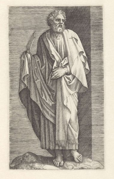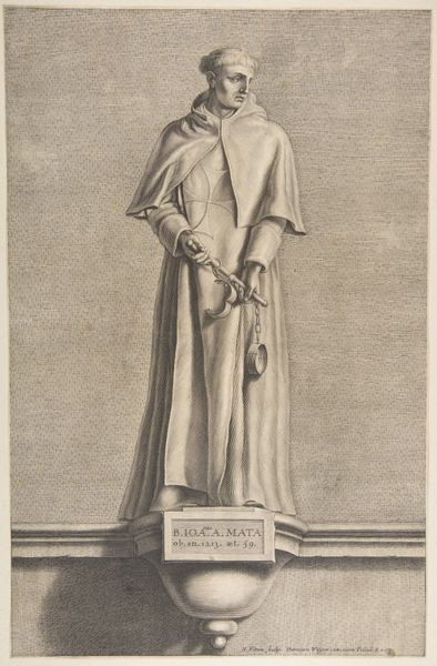 Conrad Lauwers made this print, St. Stephanus Girandi, sometime in the second half of the 17th century. Lauwers was part of a generation of artists who came of age in the shadow of Peter Paul Rubens's influential career. This print depicts a statue of St. Stephanus Girandi, a monk. Monastic life during this time was shaped by specific gender roles, hierarchical structures, and expectations for piety. Lauwers uses the print medium to explore themes of devotion, but he also engages with contemporary issues of identity and representation. The subtle rendering of the monk's features invites us to consider the humanity of the figure behind the religious image. This work provides insight into the spiritual and cultural values of the 17th century, asking us to consider how religious identity was constructed and perceived within the social context of the time.
