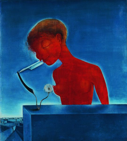 Curator: Mikuláš Medek’s "Sensitive Action," completed in 1954, is a compelling work done in oil paint, isn't it? I'm struck by how he manages to evoke such vulnerability. Editor: Yes, immediately I'm struck by a sense of raw exposure. The solitary figure rendered in that unsettling crimson, set against the cool blues—it feels incredibly exposed, almost wounded. Curator: The redness permeates, yes. Red ochre has often been associated with the primal, with lifeblood, even rituals relating to mummification practices in many cultures. So what does that bring up for you here, coupled with this exposed, intimate figuration? Editor: It emphasizes that vulnerability, as though the skin has been stripped away to reveal something profoundly raw and almost traumatized. It’s reminiscent of the political art from that era in post-war Europe. Medek was creating during a period of intense scrutiny and state control, the body almost becomes a battleground. Curator: Exactly! The obscured eye, that intense gaze from behind the mask of the hand, speaks volumes. It's reminiscent of how figures are depicted in early Byzantine iconography. Often, covering or revealing the face has very particular connotations relating to power, access and forbidden knowledge. What do you think the sensitive action is then? Editor: It seems that Medek asks who is seeing and being seen? What are the politics of gazing? I mean it feels deliberate to expose a vulnerable body with an arm and hand in the way of covering their face to also allow for a singular glaring eye. Are we the perpetrators of exploitation here? Curator: That resonates. And what a striking paradox: to partially veil the self while presenting the body so openly, the tension that arises tells a specific psychological and sociopolitical story. Editor: Definitely. Looking at this from the perspective of the observer and observed, Medek's handling of the composition is unsettling. "Sensitive Action," in that light, suggests to me that what's presented is so emotionally and politically complex that only an attuned approach is warranted. The title could be a prompt for appropriate viewing in these tense times. Curator: An astute observation, I wonder what we have been directed to glimpse beneath the surface and how our experience alters the resonance of this image. I leave contemplating Medek's creation even more acutely aware of art's potential to bear witness.