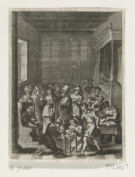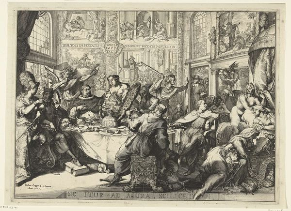 Editor: Here we have John Sloan's "Hell Hole," created in 1917 using etching and ink. It’s incredibly dense, with so many figures crammed into the scene. There’s a real sense of claustrophobia. What do you see in this piece? Curator: The title "Hell Hole" itself speaks volumes. Sloan, working within the Ashcan School, frequently depicted urban life, and this work uses symbolic imagery of crowded interiors, social drinking, and a somewhat dissolute atmosphere. Think of what "hell" means in cultural memory – is it literal fire and brimstone? Or is it the psychological space of isolation and vice? Editor: I suppose it’s a little of both? There's definitely a moral element, seeing as it's from 1917, possibly a comment on Prohibition… Curator: Exactly! Prohibition was looming, wasn't it? But even beyond that, consider the visual language: the density represents a loss of individual identity, swallowed by the collective indulgence, enhanced through a loss of detail via Sloan's heavy application of ink and shade. Is the “hell” Sloan portrays an external place, or is it found in the human heart and soul, through the repetitive, unconscious choices these patrons make in this “hole”? Notice how Sloan doesn’t depict any joyful interactions. It suggests entrapment more than enjoyment. Editor: So, it's not just a snapshot of a bar, but a commentary on social behavior, using the bar as a symbol for darker impulses. Curator: Precisely. It is social commentary encoded with a heavy moral critique, even as it acknowledges the commonality of human weaknesses and temptations. Symbols gain power because they constantly evolve with humanity. What do you take away from the symbolism of hell here? Editor: It definitely gives me a lot to think about – the symbolism elevates it beyond just a casual scene. Thanks!