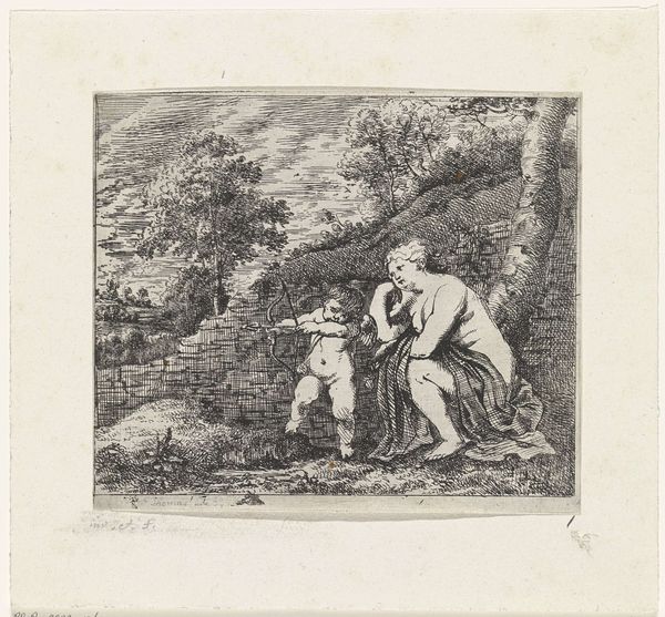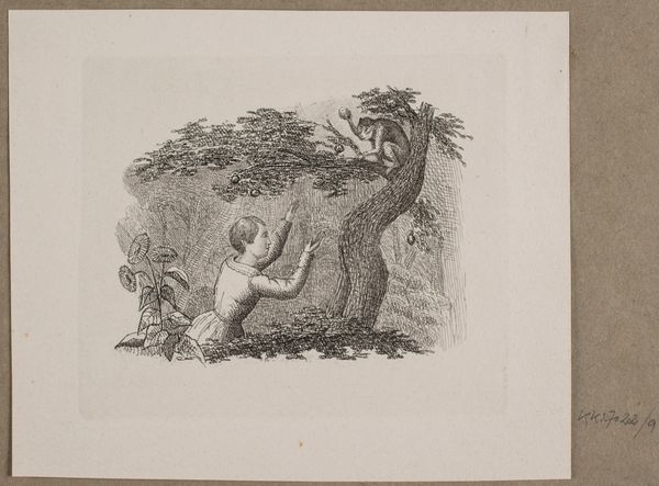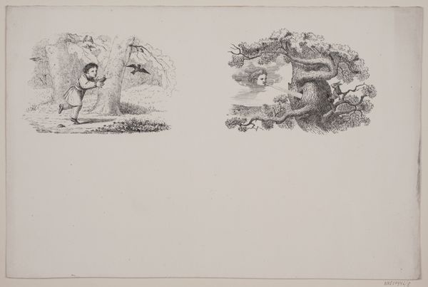 Curator: This is "To illustrationer til W. Hey 'Halvthundrede Fabler for Børn'," two illustrations for W. Hey's "Fifty Fables for Children," created around 1848. Editor: Well, looking at this lithograph, the starkness of the black ink on the paper gives the scene a quaint and almost urgent narrative quality, doesn't it? It evokes a kind of direct morality play from a bygone era. Curator: It certainly does. We can see that urgency reflected in the relationship between humanity and nature depicted here. Note the contrast of a child reaching up for a squirrel on the left versus a hunting dog eager for the cat nestled in the tree on the right. Editor: Yes, there's this feeling of opposing forces or inevitable conflicts. In the composition on the right, a fallen hat lying on the forest floor hints at the prior presence of the cat's owner, whose inability to call off their hunting dog seems indicative of humans' disruptive relationship with animals. But it begs the question: What purpose did animal symbols hold? Curator: I would venture to suggest that the image encapsulates not only that disruption, but, in alignment with the "fables" nature of this work, also points towards a child's journey of social development, which in this case involves coming to understand humans' troubled connection with non-human actors. Editor: These illustrations seem to have been meant as cautionary symbols for the viewers, likely middle-class German families seeking to educate children about class, natural order, and morality. These "morality plays" appear like little archetypes in visual form, reminding people of universal truths. But can children truly grapple with symbols and morals beyond their scope of understanding? Curator: Perhaps, but the use of simple characters is a reflection of broader cultural anxieties related to human connection with nature during the period of rising industrialization. Editor: Looking closely at the left image, though, is the interaction so dire? The child appears gentle in the reaching up to the squirrel, with little inclination for disrupting nature. In this regard, could it speak towards our responsibility to maintain the natural order? Curator: Possibly! I suppose there's a duality presented: humanity's potential to preserve as well as destroy. I hadn't considered that balance to such a strong degree, but in seeing these images as opposing moral choices, it becomes very clear. Editor: Well, I think this has enriched our appreciation of these images, revealing something essential about the nature of human interactions. Curator: Absolutely, examining art this way deepens our understanding of past generations’ values and attitudes. Thank you.
