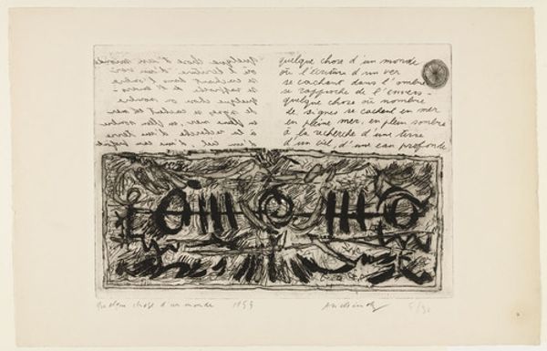 Curator: Alechinsky's "Something of a World" presents us with an intriguing puzzle, doesn’t it? The Tate holds this compelling piece. Editor: Absolutely, it’s like a half-remembered dream, all swirling lines and cryptic symbols. A bit unsettling, actually. Curator: His etching style, with those dense, almost frenetic lines, it does create a sense of unease, I agree. But look at how the handwritten text interacts with the imagery. Editor: Yes, the text seems to float above a more chaotic space, perhaps a subconscious landscape. It's as if the words are trying to bring order to the chaos below, but maybe failing. Curator: Precisely, and that tension between order and chaos, conscious and unconscious, is where the real energy of the piece lies. Editor: It leaves you with this sense of something just beyond your grasp. I appreciate that. Curator: Indeed, a glimpse into something just out of reach.