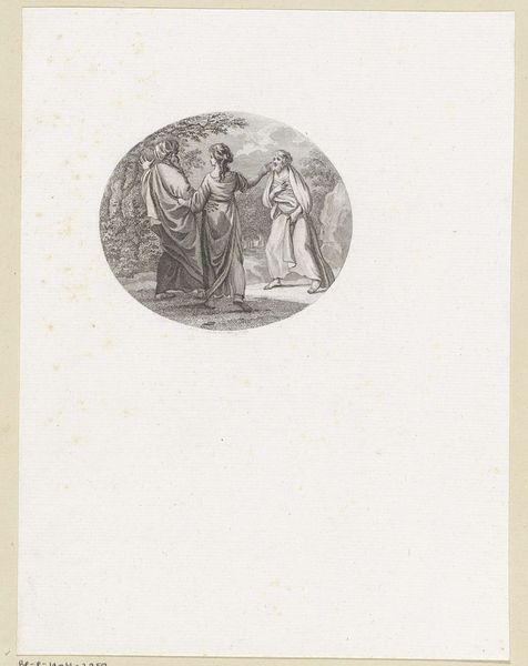 This is Reinier Vinkeles' 1805 etching, the title page for J.G. Muller's 'Ferdinand'. Vinkeles, working in the Netherlands during a period of political and social upheaval, captures a scene of domesticity that belies the tumultuous times. The image depicts a family in what appears to be a moment of transaction or farewell. A woman sits at a table, children play at her feet, while a man seems to be either receiving or giving something to a figure in a long coat. The setting is intimate, yet the interaction carries an air of formality. Vinkeles presents a view into the lives of ordinary people navigating their daily lives against a backdrop of broader historical currents. Notice how the artist situates the figures within a confined space, perhaps mirroring the constraints and limited opportunities experienced by many during this era. The expressions on their faces, though subtle, hint at the emotional complexities of their circumstances. It's a quiet, reflective piece that asks us to consider the personal stories embedded within the larger narrative of history.