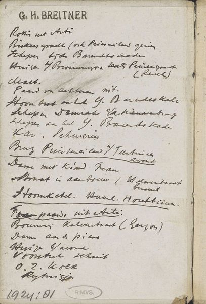 Curator: Here we have "Lijst met objecten," or "List of Objects," a drawing in ink on paper by Carel Adolph Lion Cachet, created around 1897-1898. It's currently held in the Rijksmuseum collection. Editor: It strikes me immediately as quite intimate, like a glimpse into the artist's personal world. The list format feels casual, and the handwriting is so delicate. There’s a certain warmth despite its monochrome palette. Curator: Precisely. Cachet, deeply immersed in the Art Nouveau movement, was fascinated by typography and decorative arts. This drawing offers insight into his design process, revealing his material considerations and preliminary thoughts on the types of objects he was planning to make or acquire. This sheet acted as a visual record, tying design to practical application. Editor: And the list itself provides a fascinating glimpse into the material culture of the period, no? These objects – small carpets, tables, flower stands - what do they reveal about social rituals, about the experience of interior spaces during the late 19th century? Were these mass-produced objects, or was he perhaps more involved in a "handmade" art production, closer to William Morris? Curator: That’s a very important distinction. While influenced by figures like Morris, Cachet balanced Arts and Crafts ideals with more commercial opportunities. Note that his approach here really bridges "high art" with practical craftsmanship. His lettering, his hand-drawn typeface anticipates design movements. Editor: It's intriguing how this seemingly simple list challenges conventional art categories. Is it purely a preparatory sketch, or does it hold value as a finished work, given its aesthetic qualities and the artist's careful attention to layout and lettering? What’s striking to me is that blurring of boundaries between artistic planning, material inventory, and final artwork, a phenomenon still relevant today as much as it was relevant at the turn of the last century. Curator: A really good point. Seen from our contemporary perspective, Lion Cachet seems to anticipate current discourse. The fluidity and apparent lack of hierarchy of his written thoughts challenge rigid notions of what constitutes "art" versus craft and how we understand creative labor. Editor: Exactly! Reflecting on "Lijst met objecten", I see an effort to elevate everyday objects through a conscious design process. It encourages us to reconsider what gets included and what gets left out from the conventional cannon. Curator: Absolutely. And I think Cachet encourages us to rethink the potential of art to shape—and be shaped by—our social and material world.
