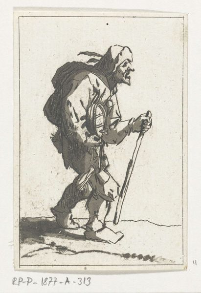 Jacob Hoolaart created this etching of a man leaning on a stick in the 18th century, using an etching needle to draw through a waxy ground on a copper plate, which was then acid-etched to create the lines that hold ink. The quality of those lines is key here; they vary in thickness and depth, creating a sense of volume and shadow despite the economy of means. This wasn't a unique invention of Hoolaart's, but part of a printmaking tradition that had become increasingly important. The etched line, in particular, lent itself to mass production – think of the illustrations in newspapers and books that circulated widely at this time. Hoolaart uses this technique to depict what is probably a commoner, resting on a stick. Ultimately, remembering the labor of the etching process itself—the skilled hand guiding the needle—allows us to appreciate the artistry involved, challenging any hard separation between the fine and applied arts.