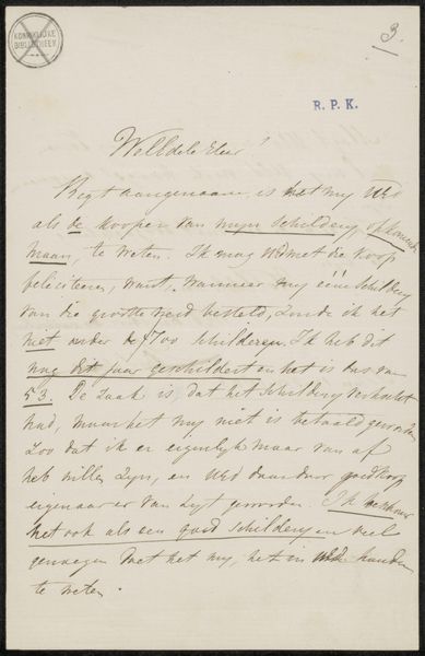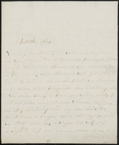 Curator: So, here we have "Brief aan de commissie van de Tentoonstelling van Levende Meesters in Utrecht," a letter dating back to maybe 1848 by Jan Willem van Borselen, currently residing at the Rijksmuseum. It's crafted with pen and ink on paper. A simple letter, yet...powerful in its silence. Editor: Absolutely! It's just a letter, but the graceful handwriting really strikes me. How would you interpret the significance of a handwritten letter, especially in the context of art and exhibitions? Curator: Well, think of it this way: letters were *the* method of communication. This isn't just about bids; it's a direct line into an artist's thinking. What was it like to engage with the art world back then, submitting paintings not via email, but painstakingly written pleas? It breathes with a unique intimacy that we've largely lost, don't you think? Editor: That's true. I never thought of the slowness itself adding another layer. Now, knowing it’s addressed to an exhibition, is he advocating for his own work? Curator: Most likely, yes! It wouldn’t be absurd if he subtly emphasized his landscape’s allure. Consider the vulnerability artists faced, awaiting validation with no immediate feedback. This letter isn’t *just* an artifact; it encapsulates anticipation, doesn't it? Editor: Definitely. It makes you wonder what he wrote exactly and whether he got accepted to the exhibition in the end! Thanks for revealing these rich dimensions. Curator: My pleasure. Art is never just about what's on the surface, right? It's the untold stories swirling around.
