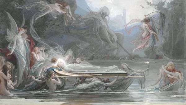 Editor: Wow, the mood is overwhelming; it's darkness shot through with furious light, almost like a memory of something colossal breaking. Curator: Precisely! We’re looking at Maxim Vorobiev’s "Oak Fractured by Lightning. Allegory on the artist's wife death," created in 1842. Oil on canvas. Editor: "Allegory" hits the nail right on the head, doesn't it? It's nature mirroring human emotion, romanticism at its peak. How might Vorobiev's personal loss influence his rendering of, say, the tree's vulnerability here? The fractured branches, the almost desperate reaching. Is that mourning made visible? Curator: Definitely. Think about it: an oak tree, a symbol of strength and longevity, instantly undone. There's a real sense of personal grief in that quick shift from monumental to tragically ruined. A symbol becomes its inverse, reflecting a permanent change. Editor: I read this work in conversation with other depictions of widowhood from the era; for women especially, premature loss of one's partner, such as the passing of an artist's muse, brings societal vulnerability and the threat of economic precariousness. But where's the figure in this composition, Vorobiev’s rendering of this complex societal fate, beyond that allegory? Curator: It’s there, suggested rather than stated, isn't it? The way the lightning strikes—almost lovingly—yet destroys. The sky above is an oppressive dark, pushing down and filling the scene with a sense of divine abandonment, as much about society as his soul. And isn’t this painting of a subjective landscape infinitely more intimate, more vulnerable, than a standard portrait might ever have been? Editor: I think you're right. By using this sublime visual language, the intensity of nature reflecting internal turmoil, Vorobiev circumvents limitations of acceptable expressions of gendered experience. He paints the enormity of grief, unconstrained. Curator: Leaving us with something raw and resonating, long after the storm has passed. Editor: Indeed, something enduring—an understanding of grief and how artists try to create safety and meaning amid trauma.