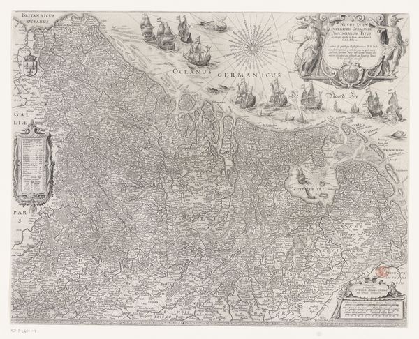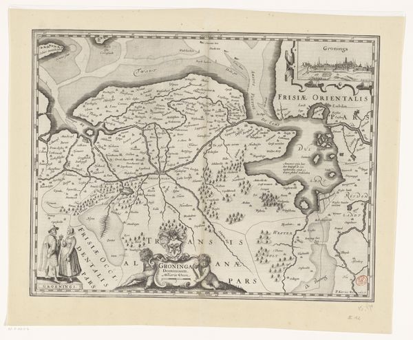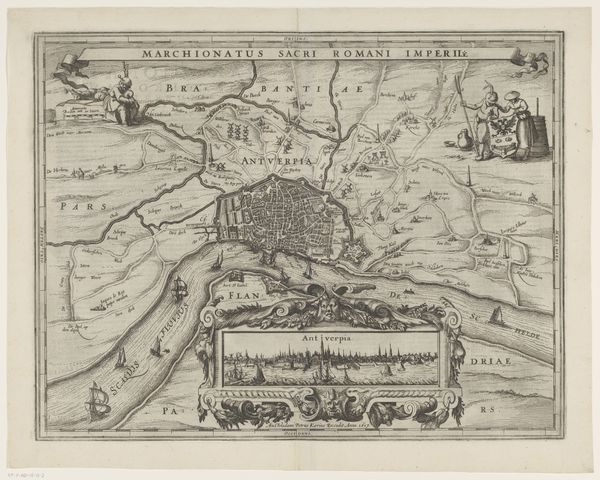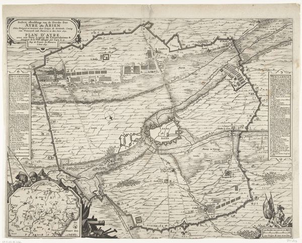 This is a print made by Abraham Dircksz Santvoort, commemorating the siege and capture of Hulst in 1645. The printmaking process, often involving etching or engraving on a metal plate, allowed for the mass production of images and the dissemination of information. The fine lines and details of the map underscore the engraver’s skill in translating a bird’s-eye view of Hulst and its surrounding landscape. This required careful planning and execution, indicative of a time when cartography was both a science and an art form. Such prints weren't just decorative; they were strategic tools used to communicate military successes and political power. The labor-intensive process of creating these prints contrasts sharply with the speed at which they could be distributed, influencing public perception and solidifying national identity. By considering the material and process, we gain insight into the complex relationship between art, politics, and society in 17th-century Netherlands.