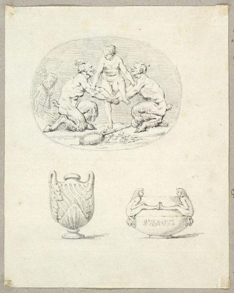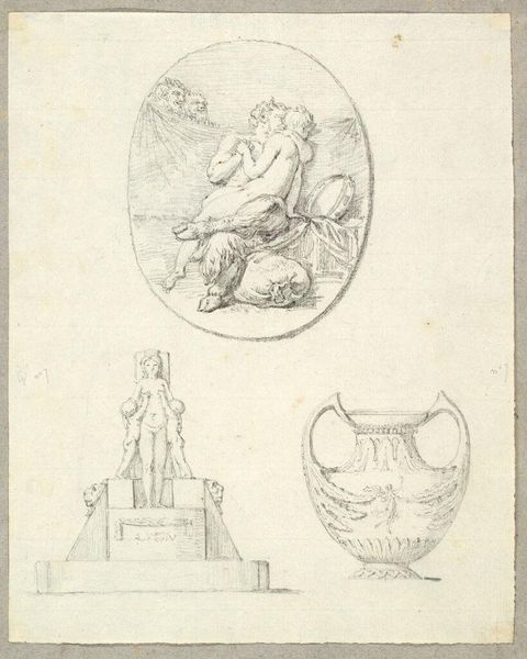 Curator: This sheet presents Jean-Honoré Fragonard's "Study for a Relief of Winged Female Figures (Victories?) flanking a Monument; Studies for Three Vessels," part of the Harvard Art Museums collection. Editor: It feels almost ethereal. The light pencil strokes give the whole piece a sense of delicate impermanence, like catching a fleeting vision. Curator: Indeed. The central relief, depicting winged figures crowning a monument, speaks to Fragonard's engagement with antiquity and its potential for civic virtue and national aspiration. Editor: The winged figures, though, they're not just about victory, are they? They seem to embody a more profound sense of grace, of ethereal blessing or remembrance. And then there are these vessels each with its own symbolism. Curator: Precisely. We see Fragonard here grappling with forms laden with historical and cultural weight. The vessels themselves hint at rituals, sacrifice, and commemoration. Editor: It's fascinating how he blends the monumental with these intimate objects. He invites us to ponder themes of memory and the enduring power of symbols. Curator: Absolutely. Fragonard compels us to consider how images shape our understanding of history and legacy. Editor: It’s an invitation to explore those echoes from antiquity that resonate still.