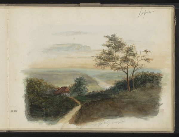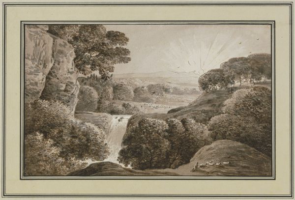 Curator: Welcome. Today, we are looking at a piece called "Landscape with a Wayfarer," attributed to Adam Elsheimer. Editor: It has such a muted palette; browns, grays, very subdued. Immediately gives me a sense of quiet melancholy, the landscape itself seems almost to be sighing. Curator: That mood, I think, connects to Elsheimer's historical context. Landscapes were gaining prominence, mirroring shifting societal views on nature, but were they simple depictions of idealized locales or reflections of a rapidly changing world? The figure walking through seems like an answer to those questions, in his solitude. Editor: True, and I wonder about the materials at play here. Given the details in the rendering, I’d venture that this might be watercolor and ink, but how were these materials sourced and perceived at the time? The accessibility of pigments surely dictated the wider production and consumption of such works. It has to make you wonder about the labor to grind, mix and produce, which is essential. Curator: Certainly, and in addition, this work reveals how patronage shaped artistic choices. Collectors of landscapes, and paintings featuring scenes of every-day life, were beginning to emerge in different countries throughout Europe, influencing artists to produce art that they could connect to through these scenes. It highlights how Elsheimer negotiated the artistic demands of his patrons while pushing genre conventions of his period. Editor: I think the perspective—the sharp detail softening into hazy distance—speaks to his skills as a technician and that artistic background. It pushes against some "high art" standards by turning to a scene with an anonymous figure to center stage. This makes the landscape not just a backdrop, but an active element in the story of human endeavor. Curator: A great observation. The landscape itself mirrors the man's internal state or journey, doesn’t it? These everyday landscapes, like the smaller scale of the artwork itself, reflect the change of focus onto ordinary life. Editor: Exactly! The choice of common materials, too, is of consequence; perhaps Elsheimer challenged hierarchical structures within the artistic world, suggesting profound artistic meaning lies within familiar media, familiar figures and landscapes. Curator: It appears that it has all these meanings simultaneously, depending on the lens with which you choose to explore its context. Editor: An insightful final thought. It reveals layers beyond its surface to anyone who might approach and contemplate.