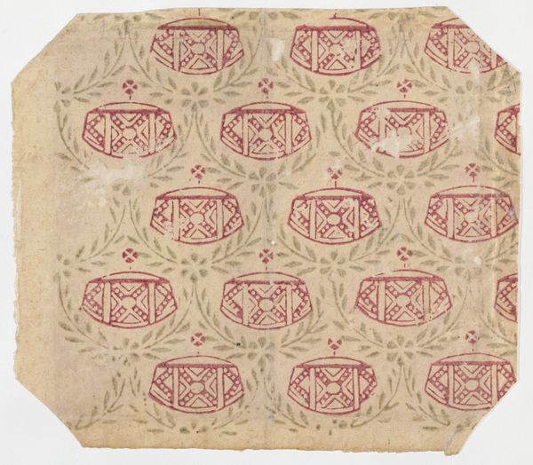 This small sheet presents an overall pattern of rosettes made with ink and watercolor by an anonymous artist. The eye is immediately drawn to the systematic arrangement of floral motifs and the grid that supports them. The composition is deceptively simple: a network of diagonal lines intersects to form diamond shapes, within each of which sits a rosette. Alternating colours of yellow and red add a subtle rhythm to the design, while the lines are punctuated with small, square nodes at each intersection. The materiality of the work is also crucial. The ink and watercolor give the pattern a delicate, almost ephemeral quality, as if the design could fade away at any moment. This reflects broader artistic concerns about the relationship between structure and fluidity, order and chaos. The pattern invites us to question fixed meanings and engage with new ways of thinking about space and representation. It reminds us that art is not just about aesthetics, but about the ongoing interpretation and reinterpretation of cultural and philosophical ideas.