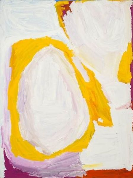 Curator: Here we have Sally Gabori's "Makarrki," painted in 2008 using acrylic on canvas. The work is an interesting example of abstract expressionism. Editor: It strikes me immediately with its bold use of colour. The fuchsia sky clashes vibrantly against the crimson and white ground. The large, dominant column in monochrome draws my eyes into a swirling landscape of tension. Curator: Exactly. Gabori uses colour not just descriptively, but structurally. Notice how the application of each shade creates its own distinct plane? There’s a palpable push and pull. We could analyze the brushwork to understand her method, it has very rhythmic dynamism, pushing us toward interpreting this work gesturally. Editor: That gestural energy is definitely evident, but I can’t help but also think of the social history tied to Indigenous Australian art and its sudden recognition within a Western framework. I am drawn to understand how this abstract visual language operates both within and against the ethnographic gaze. Gabori didn't start painting until she was in her 80's! Curator: Absolutely, the history is crucial, especially when discussing any First Nations art; however, it’s vital not to limit it to only that discourse. Let's analyze the formal elements: the composition avoids any central focal point. It invites the eye to wander, constantly finding new relational connections across its entire surface. Editor: And consider the role of institutions. It would be interesting to investigate how, through the establishment of art centres and increased museum acquisitions, Indigenous art moved from anthropological artefact to celebrated contemporary art in Australia. Did that re-contextualization then influence art making? Curator: I'm more inclined to think her intrinsic vision came first. In conclusion, viewing Gabori’s work is quite rewarding because its chromatic strategies work together, in tension, allowing our eyes to participate dynamically with the image. Editor: It is remarkable how viewing a piece such as “Makarrki” brings forward the intricate relationship between place, person, and paint. Art becomes this space, for us, where memory and history begin.