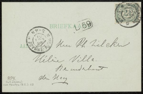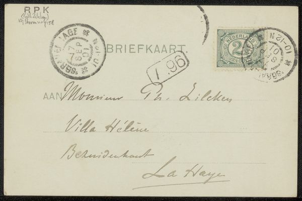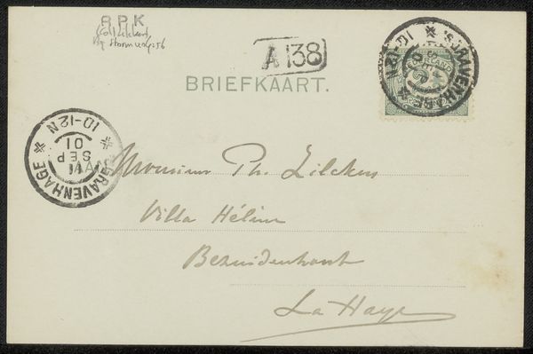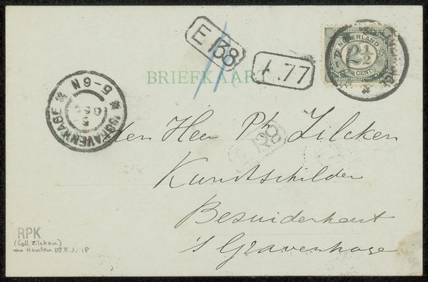 Editor: Here we have Barbara Elisabeth van Houten’s "Briefkaart aan Philip Zilcken," made with pen and ink sometime before 1912. The hand-lettering is really striking and nostalgic to me, so what are your initial thoughts when you see this piece? Curator: What stands out immediately are the marks of transit, the postal stamps, and how they intersect with the personal script. Each postal mark is a symbolic assertion of time, place, and purpose; their convergence hints at cultural continuity and a network that binds individuals. Editor: So you see those marks as representing cultural connection? Curator: Precisely! Think about what the act of sending a letter meant then – anticipation, tangible connection across distance. How does the visual language used by Van Houten, the way she arranges the words on the card, connect with those sentiments for you? Does it evoke the same intimacy, or does it bring to mind something different? Editor: I do get a sense of intimacy, definitely. The handwriting feels very personal, almost like a glimpse into the artist's mind. It’s interesting how such a commonplace object could carry so much emotional weight. Curator: Exactly. The everyday, the quotidian act of correspondence is elevated through Van Houten’s care and attention. It becomes an artifact laden with layers of meaning, connecting sender, receiver, and ultimately, us. Editor: It makes me appreciate how much intention and thought went into simple communications. Thanks for illuminating the hidden depths. Curator: My pleasure. It reminds us to look beyond the surface of even the simplest things, and consider the emotional and cultural memory that they carry.